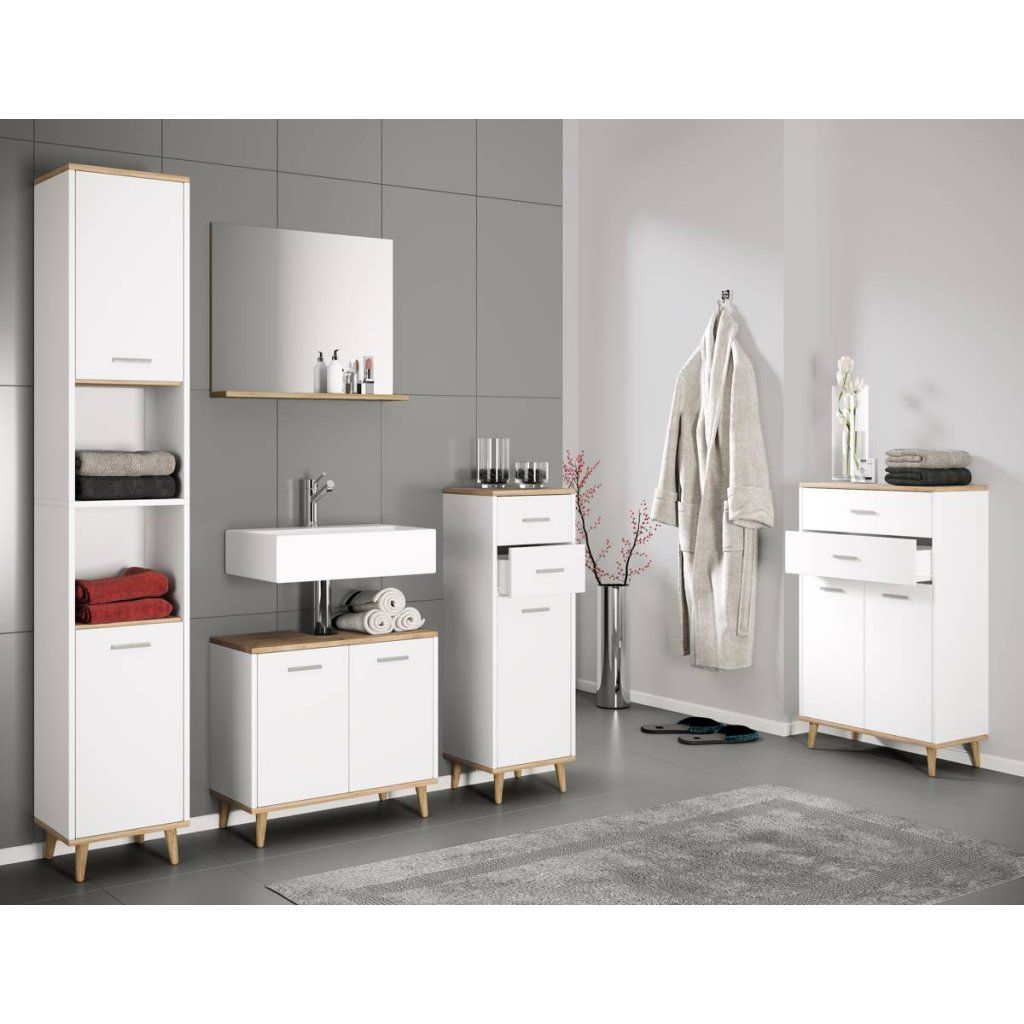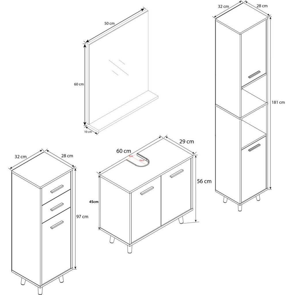 Súprava obsahuje: - 1x skrinka pod umývadlo - 1x stredná skrinka - 1x vysoká skrinka - 1x zrkadlo Kúpeľňová súprava VCM "Landos I" nie je len vizuálnou atrakciou. Vďaka svojmu jednoduchému a nadčasovému dizajnu sa súprava hodí takmer do každej kúpeľne. Vďaka melamínovej povrchovej úprave sa kúpeľňový nábytok mimoriadne ľahko čistí a je odolný voči vlhkosti. Skrinka pod umývadlo: - Rozmery cca v. 56 x š. 60 x hl. 28 cm - Dvoje otočné dvierka s veľkou priehradkou Stredná skrinka - Rozmery cca v. 97 x š. 32 x hl. 28 cm - Jedny otočné dvierka s dvoma priehradkami - Dve praktické zásuvky Vysoká skrinka - Rozmery cca v. 181 x š. 32 x d. 28 cm - Dvoje otočné dvere s dvoma priehradkami - Dve ďalšie otvorené priehradky Zrkadlo z bezpečnostného skla ESG - Rozmery cca v. 60 x š. 50 x d. 10 cm - Úložný priestor š. 50 x d. 8 Pozornosť venovaná detailom robí z kúpeľňového nábytku VCM niečo výnimočné. Spoločnosť VCM sa od 70. rokov minulého storočia špecializuje na navrhovanie, výrobu a distribúciu nábytku za primeranú cenu a zariadila ním milióny domácností.Dodatočné parametre