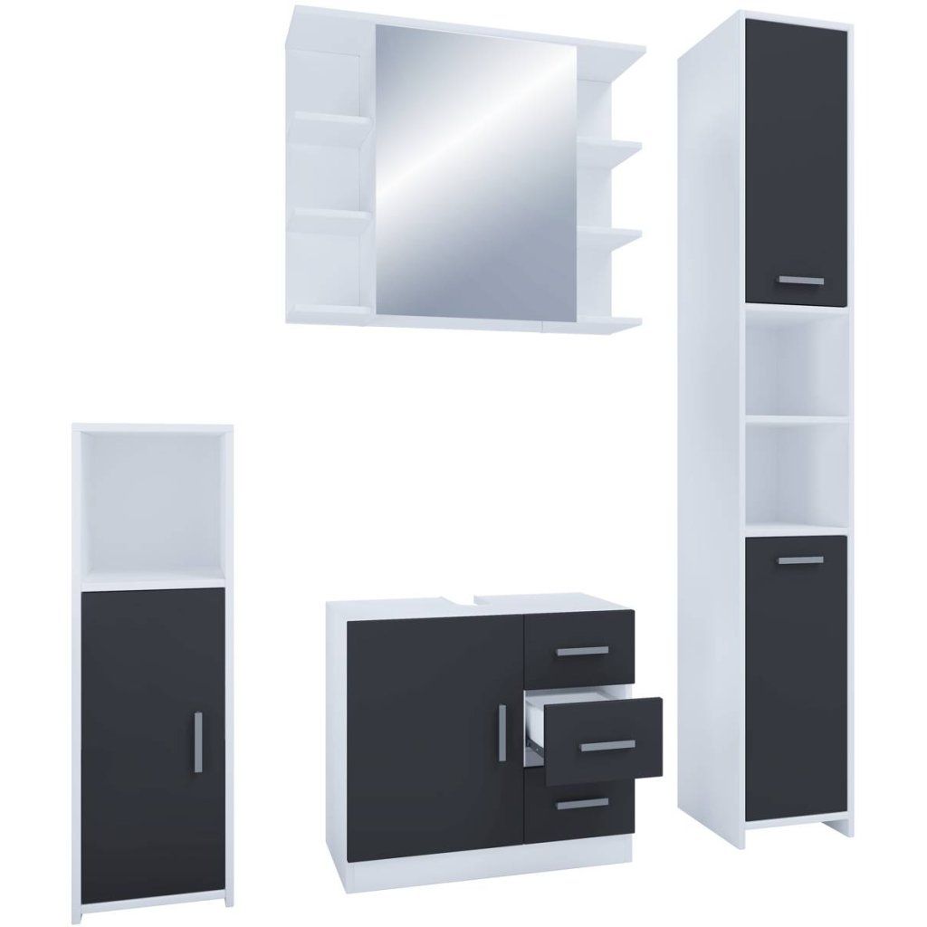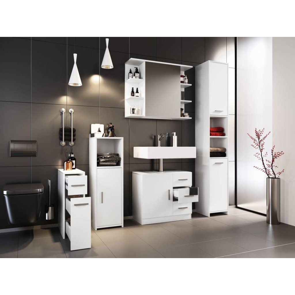 Súprava obsahuje: - 1x skrinka pod umývadlo - 1x stredná skrinka - 1x vysoká skrinka - 1x zrkadlová skrinka. Kúpeľňová súprava VCM "Zalo III" nie je len vizuálnou atrakciou. Vďaka svojmu jednoduchému a nadčasovému dizajnu sa súprava hodí takmer do každej kúpeľne. Vďaka melamínovej povrchovej úprave sa kúpeľňový nábytok mimoriadne ľahko čistí a je odolný voči vlhkosti. Skrinka pod umývadlo: - rozmery cca v. 56 x š. 63 x hl. 30 cm - jedny otočné dvierka s jednou veľkou priehradkou - tri zásuvky Stredná skrinka - rozmery cca v. 95 x š. 30 x hl. 30 cm - jedny otočné dvierka s tromi priehradkami - jedna ďalšia otvorená priehradka Vysoká skrinka - rozmery cca v. 180 x š. 30 x hl. 30 cm - Dvoje otočné dvere s dvoma priehradkami - Dve ďalšie otvorené priehradky Zrkadlová skrinka z bezpečnostného skla ESG - Rozmery cca v. 64 x š. 80 x hl. 21 - Jedny otočné dvere s dvoma priehradkami - Šesť ďalších otvorených priehradiek Pozornosť venovaná detailom robí z kúpeľňového nábytku VCM niečo výnimočné. Spoločnosť VCM sa od 70. rokov minulého storočia špecializuje na navrhovanie, výrobu a distribúciu nábytku za primeranú cenu a vyzdobila ním milióny domácností.Dodatočné parametre