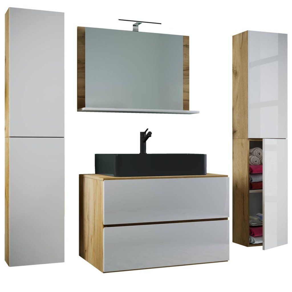 5-dielna umývadlová skrinka Lendas BL XL 80 cm so zrkadlom a 2 vysokými skrinkami, dub medový