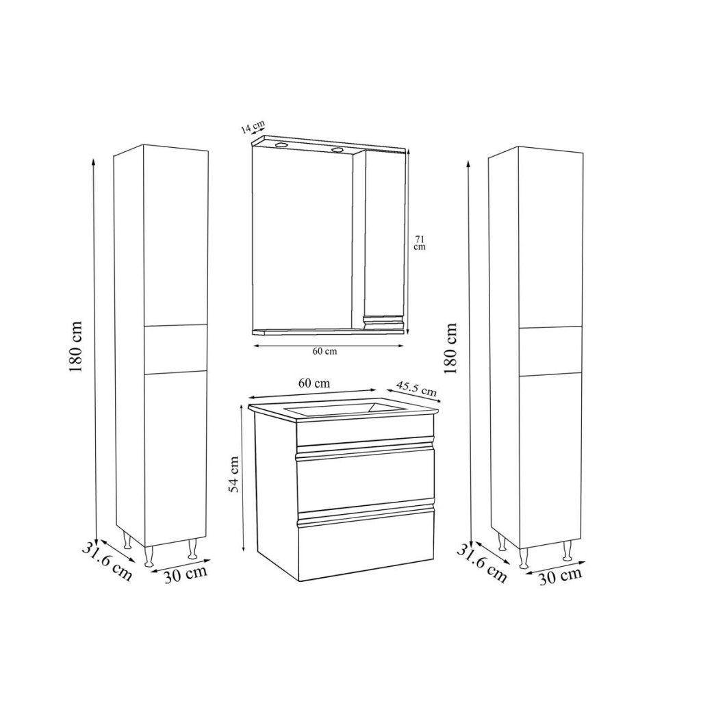Súprava obsahuje: - 1x spodnú skrinku s dvoma zásuvkami - 1x keramické umývadlo - 1x zrkadlovú skrinku - 2x vysokú skrinku. Kúpeľňová zostava VCM "Silora" sa skladá zo spodnej skrinky s dvoma zásuvkami a umývadlom z masívnej keramiky, zrkadlovej skrinky a dvoch vysokých skriniek. Dizajnér zámerne zvolil čelá bez úchytiek, aby nábytok nadčasovo splynul s okolím. Skrinka pod umývadlo: - rozmery v 54 x š 60 x h 46 cm - korpus s robustným a odolným melamínovým povrchom - dve zásuvky bez úchytiek Umývadlo: - rozmery š 60 x h 46 cm - vyrobené z robustnej keramiky Zrkadlová skrinka: - Rozmery V 71 x Š 60 x H 14 cm - Korpus s robustným a odolným melamínovým povrchom - Jedny výklopné dvierka Vysoká skrinka: - Rozmery V 180 x Š 30 x H. 32 cm - Korpus s robustným a odolným melamínovým povrchom - Dvoje výklopné dvierka a jedna zásuvka Kúpeľňovú súpravu možno doplniť ďalším kúpeľňovým nábytkom zo série "Silora". Spoločnosť VCM sa od 70. rokov minulého storočia špecializuje na navrhovanie, výrobu a distribúciu cenovo výhodného nábytku a zariadila ním milióny domácností.Dodatočné parametre