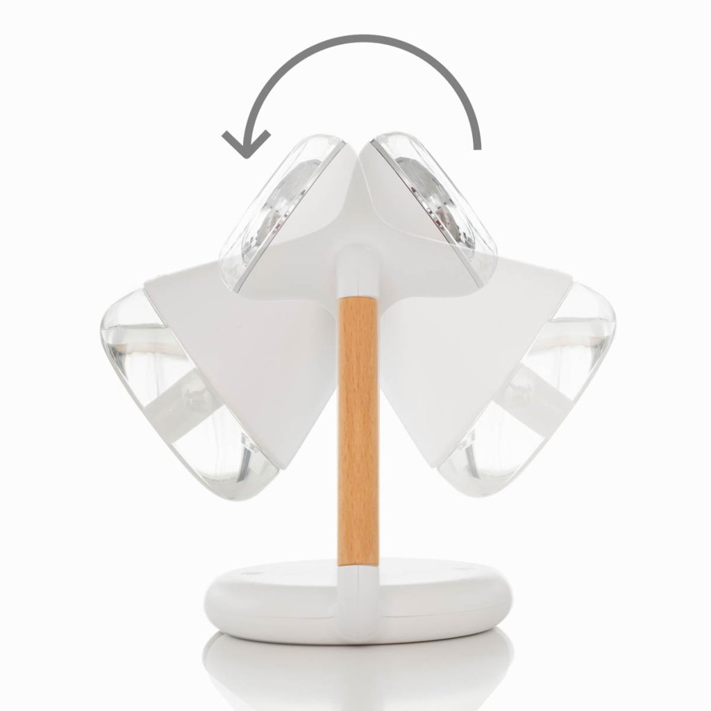 Originálny zvlhčovač vzduchu a mobilný stojan s rýchlym bezdrôtovým nabíjaním. Vďaka dekoratívnemu, kompaktnému a tichému dizajnu je ideálny do domácnosti alebo kancelárií. Do nádržky je možné tiež pridávať kvapky esencií a vytvoriť z neho aróma difuzér. Má tlačidlo zapnúť/vypnúť, nádržku s objemom 230 ml, automatické vypnutie po 4 hodinách a LED kontrolky indikujúce pripojenie a prevádzku bezdrôtového nabíjania. Pretože je viacpolohový s nastaviteľným uhlom až 180º, ľahko sa tiež prispôsobí do požadovanej polohy. Jednoduchý a elegantný spôsob ako si doma alebo v práci užiť príjemnejšie a uvoľnenejšie prostredie. Nie je dobíjacia a k prevádzke je potrebné ho pripojiť. Súčasťou balenia je kábel USB na micro USB a náhradné bavlnené valčeky.