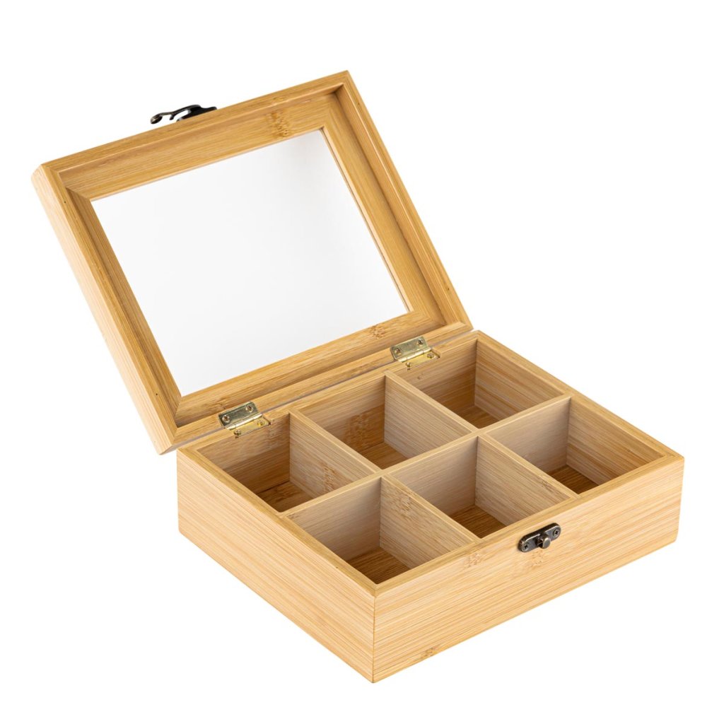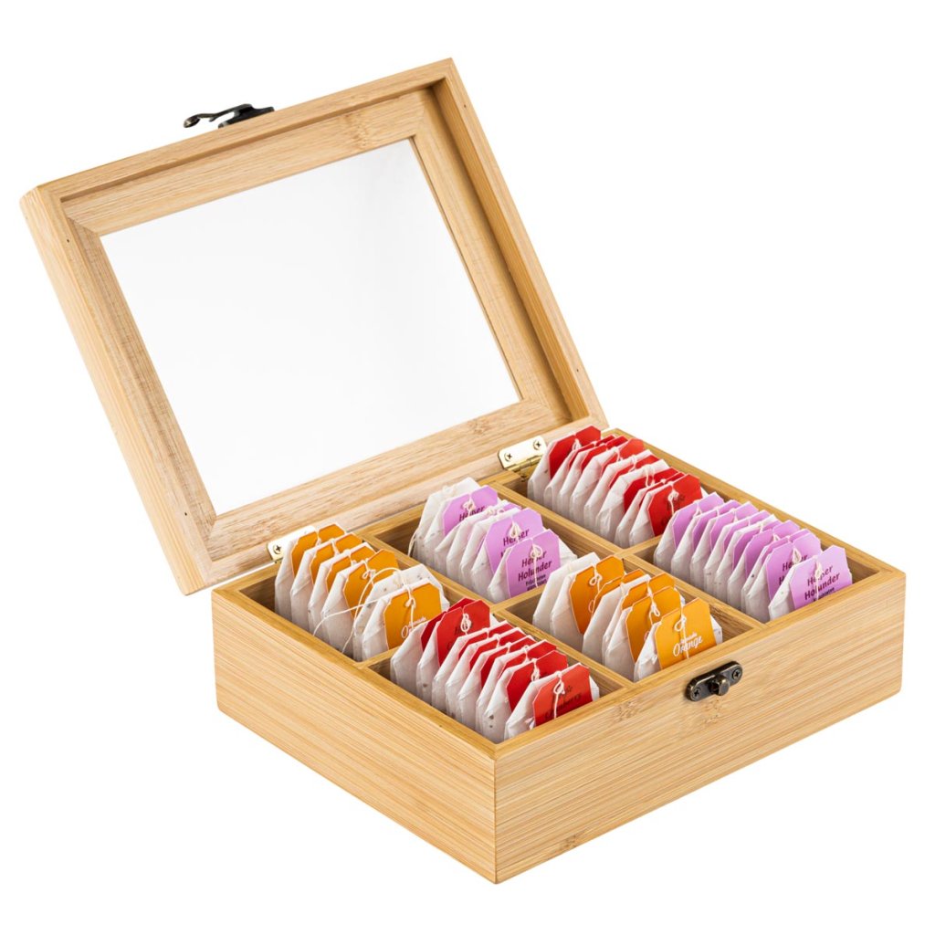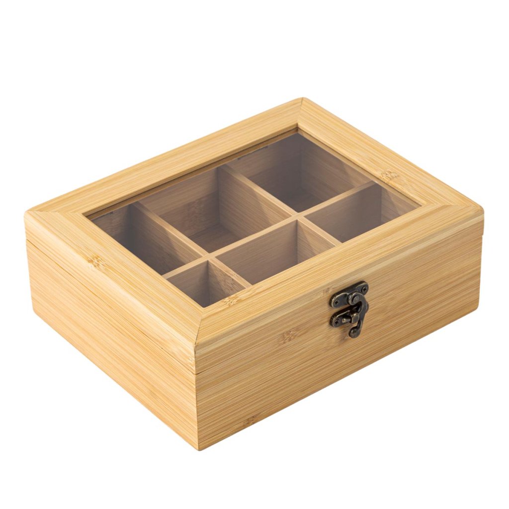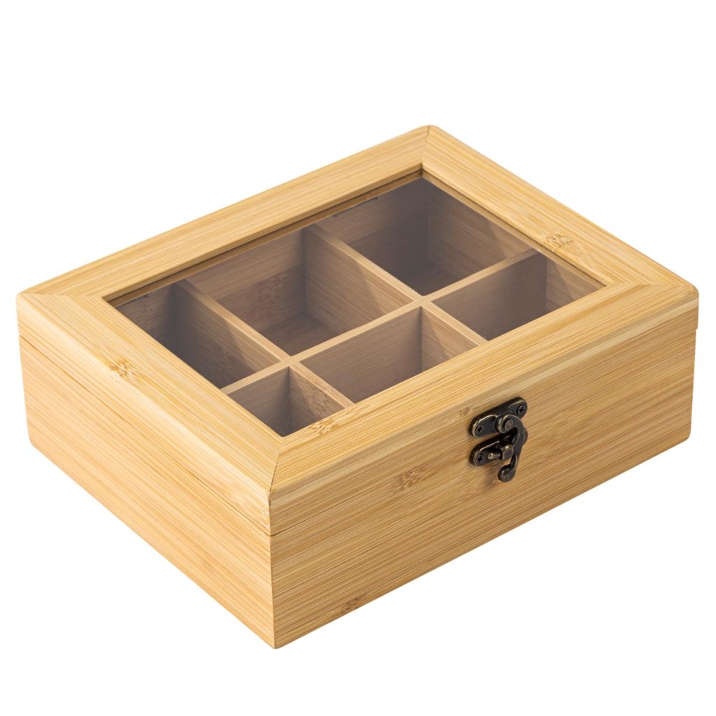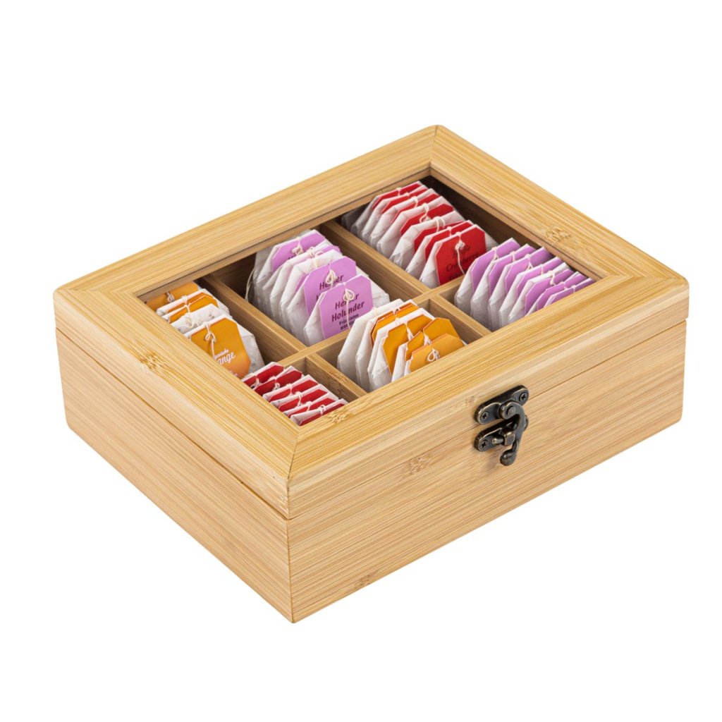 Kto by nepoznal množstvo čajov a rôznych balení, ktoré zaberajú miesto v kuchyni. Táto praktická dóza na čaj prináša prehľadnú organizáciu a štýlové riešenie na uskladnenie. Box z bambusu obsahuje 6 priehradiek, z ktorých každá pojme približne 15 čajových vrecúšok. Vďaka priehľadnému viečku máte obsah vždy pod kontrolou. Prírodný bambus je pevný, ľahký a odolný materiál s dlhou životnosťou, ktorý je ideálny do každej kuchyne.