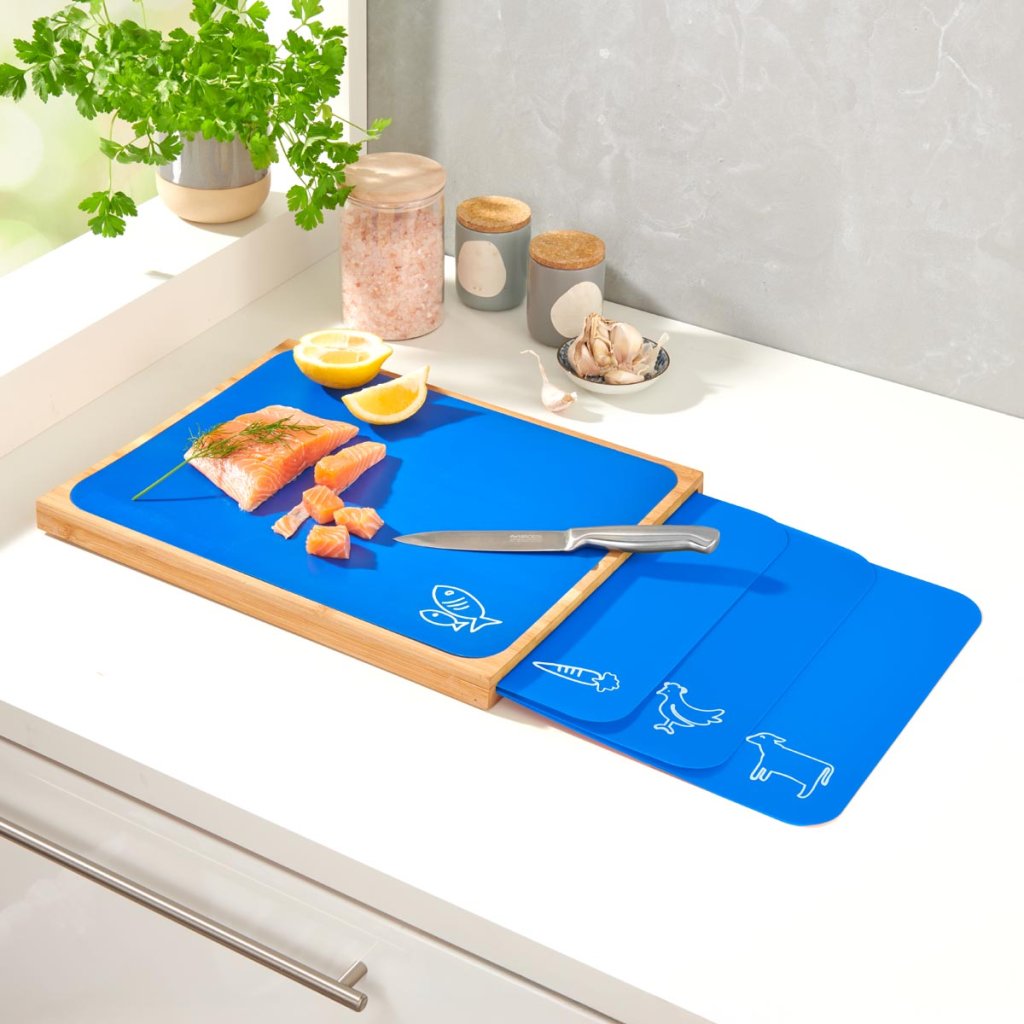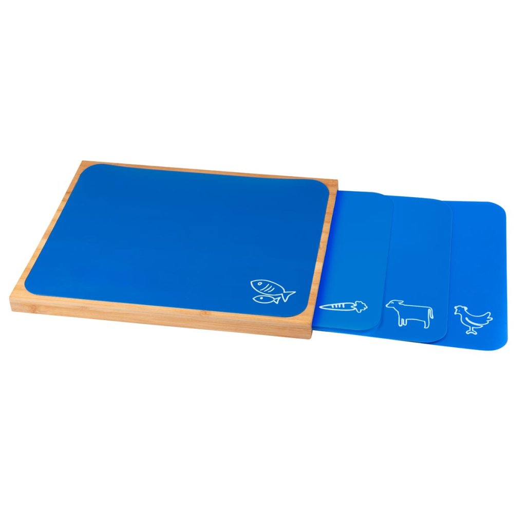 Táto súprava na hygienické krájanie obsahuje bambusovú krájaciu dosku a štyri samostatné podložky s piktogramami na ryby, zeleninu, hydinu a mäso. Doska na krájanie slúži ako stabilný podklad pre podložky aj samostatne a je vhodná aj ako odkladacia plocha pre horúce hrnce.