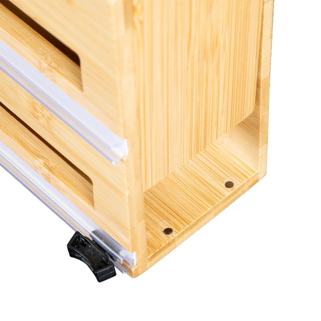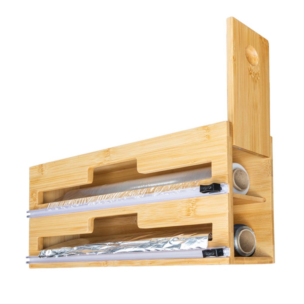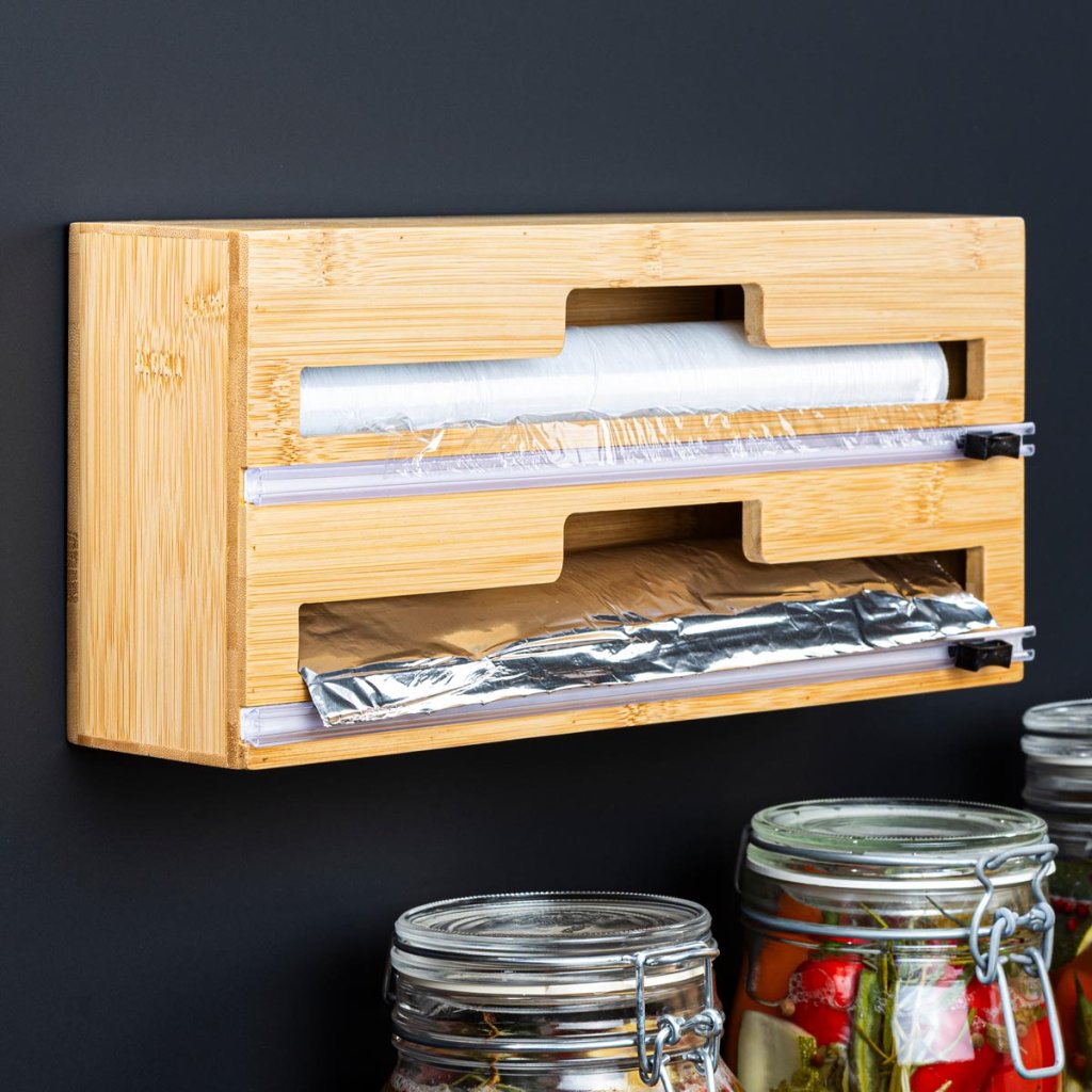 Výsuvný bambusový držiak na kuchynské rolky s rezačkou je praktickým kuchynským pomocníkom.