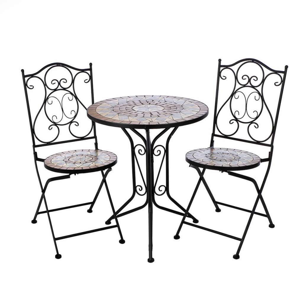 Vytvorte si štýlové a pohodlné sedenie na balkóne, terase alebo v záhrade. Táto elegantná balkónová súprava sa skladá z okrúhleho stola a dvoch stoličiek s ozdobnou mozaikou, ktorá dodáva nábytku originálny vzhľad. Jemné kovové zdobenie v kombinácii s keramickou mozaikou pôsobí romanticky a dokonale doplní každý vonkajší priestor.
