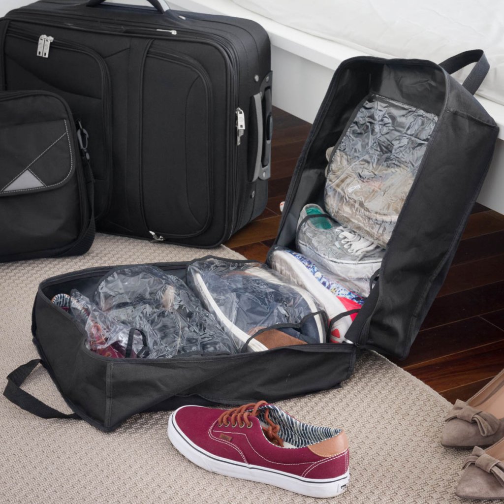 Praktická, pohodlná a diskrétna cestovná taška, ktorá udržiava vašu obuv separátne uloženú od ostatných vecí a ešte bude zaberať menej miesta. Uložíte do nej až 6 párov topánok. Vyrobené z polyésteru a PVC.