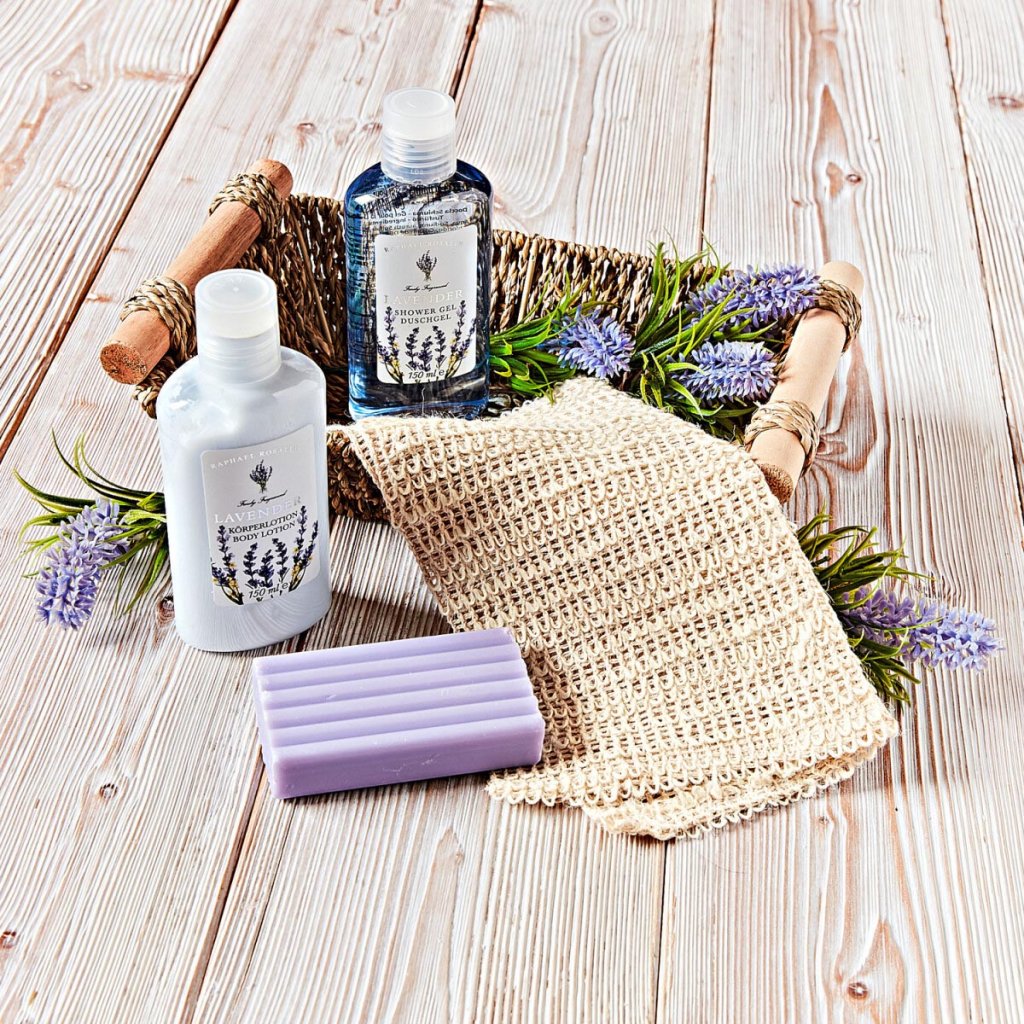 Doprajte svojim blízkym aj sebe nádherne voňavé potešenie s touto 5-dielnou sadou: levanduľový sprchový gél, levanduľové telové mlieko, jemné čistiace mydlo, peelingová handrička a praktický ozdobný košík.