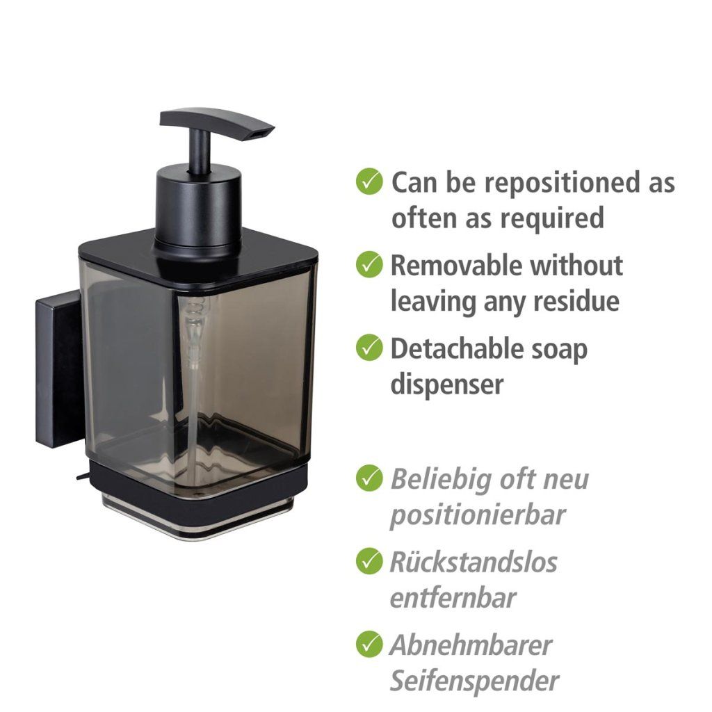 Dávkovač mydla na stenu je vybavený odnímateľnou nádobou z vysokokvalitného plastu v transparentnej čiernej farbe a držiakom z nehrdzavejúcej ocele. Dávkovač sa ľahko dopĺňa a pojme približne 340 ml tekutého mydla. Vákuový systém zaisťuje pevné uchytenie na hladkých a nepriepustných povrchoch a umožňuje opakované premiestňovanie bez poškodenia steny.