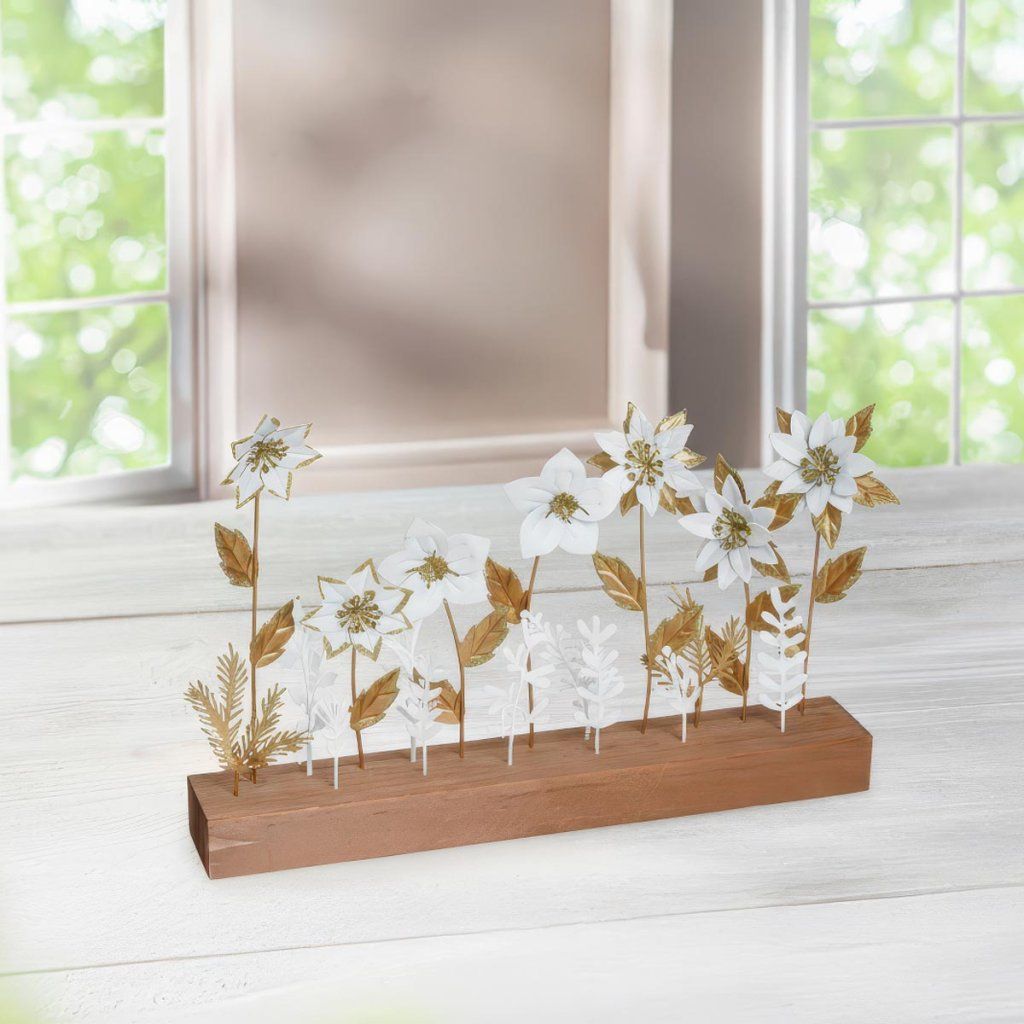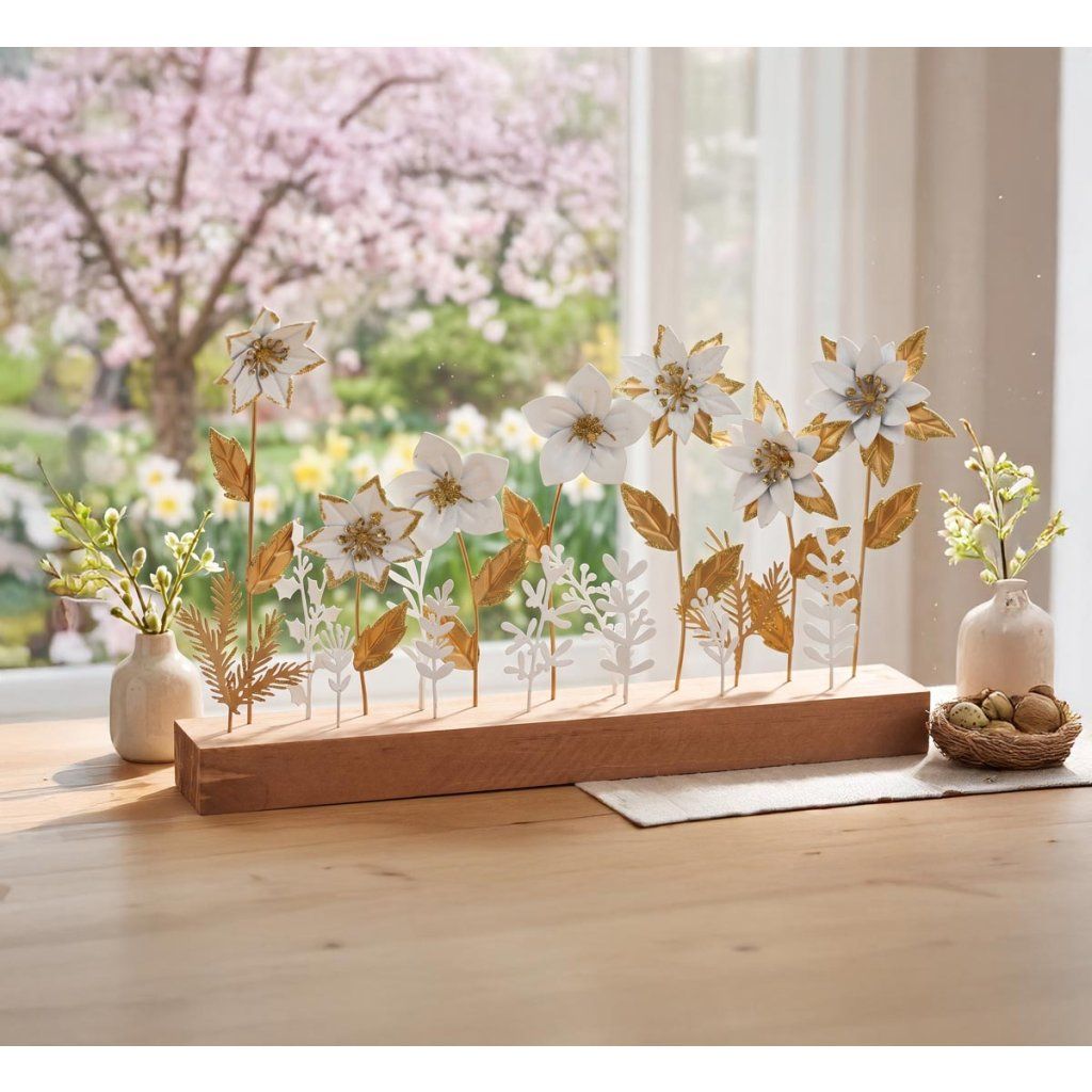 Táto elegantná dekorácia z kovu a dreva kombinuje prírodné materiály s moderným dizajnom. Táto dekorácia s rozmermi 33 × 20 × 5 cm, ručne vyrobená z kovu a dreva v bielej a zlatej farbe, vnesie do vášho interiéru nádych sviežosti. Je ideálna na ozdobenie stola, parapetu alebo ako štýlový darček.