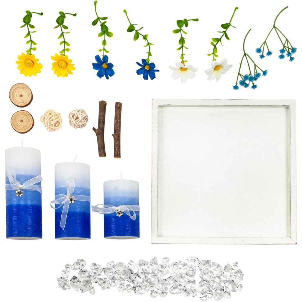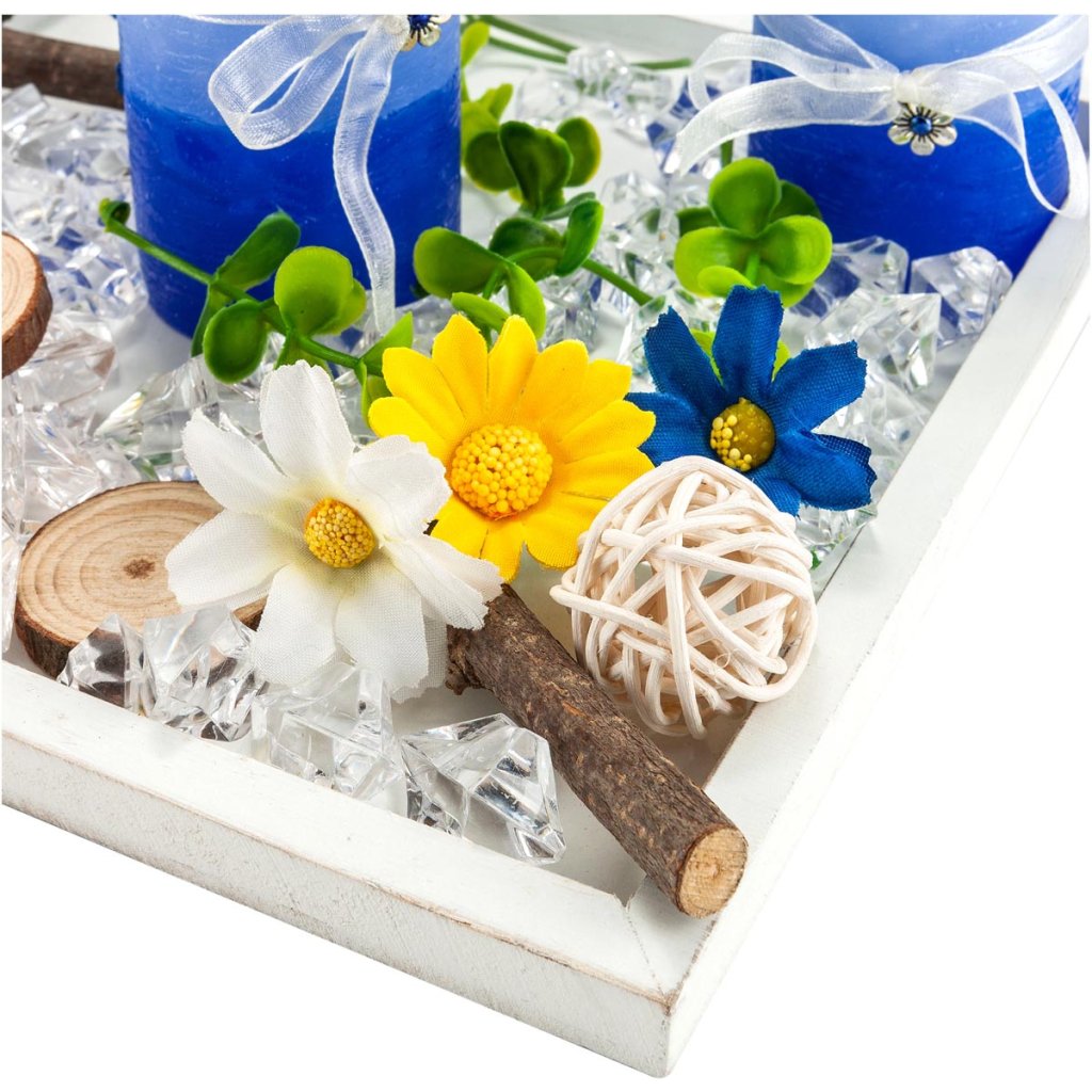 Kompletná sada dekorácií obsahuje tri voskové sviečky a rôzne dekoračné materiály v osviežujúcich odtieňoch modrej farby v kombinácii so žiarivo žltou, zelenou a bielou. Jej súčasťou je aj drevený podnos, na ktorom môžete všetky kúsky rozmiestniť podľa vlastného vkusu.