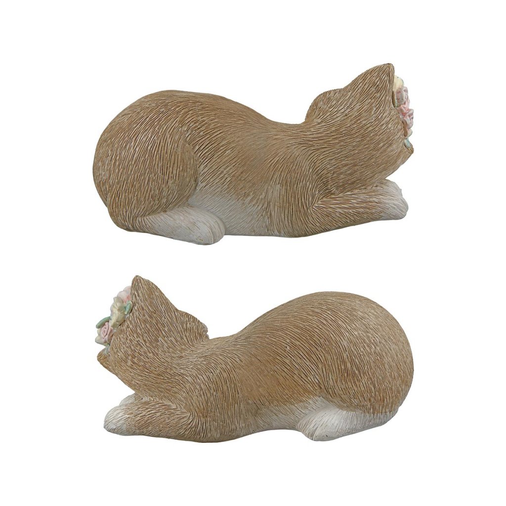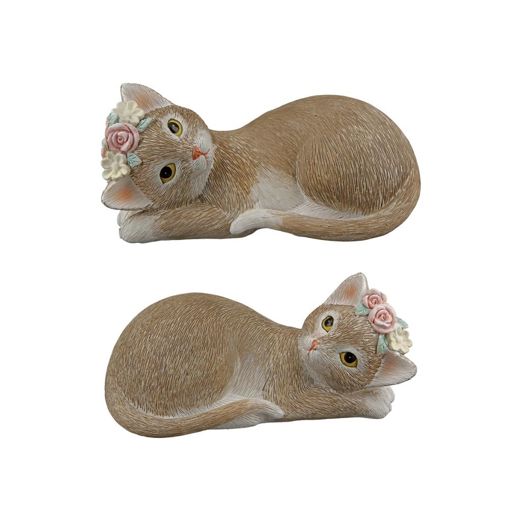Elegantná dekorácia dvoch mačiek vnesie do vášho domova nádych nehy a harmónie. Táto dekoračná figúrka je vyrobená z kvalitnej umelej živice v jemných krémovo hnedých tónoch. Jedna z mačiek má hlavu zdobenú kvetmi, ktoré dodávajú celej kompozícii romantický vzhľad. Ideálne sa hodí ako štýlová socha do interiéru na poličku, komodu alebo parapet. Dobre poslúži aj ako originálny darček pre milovníkov zvierat.