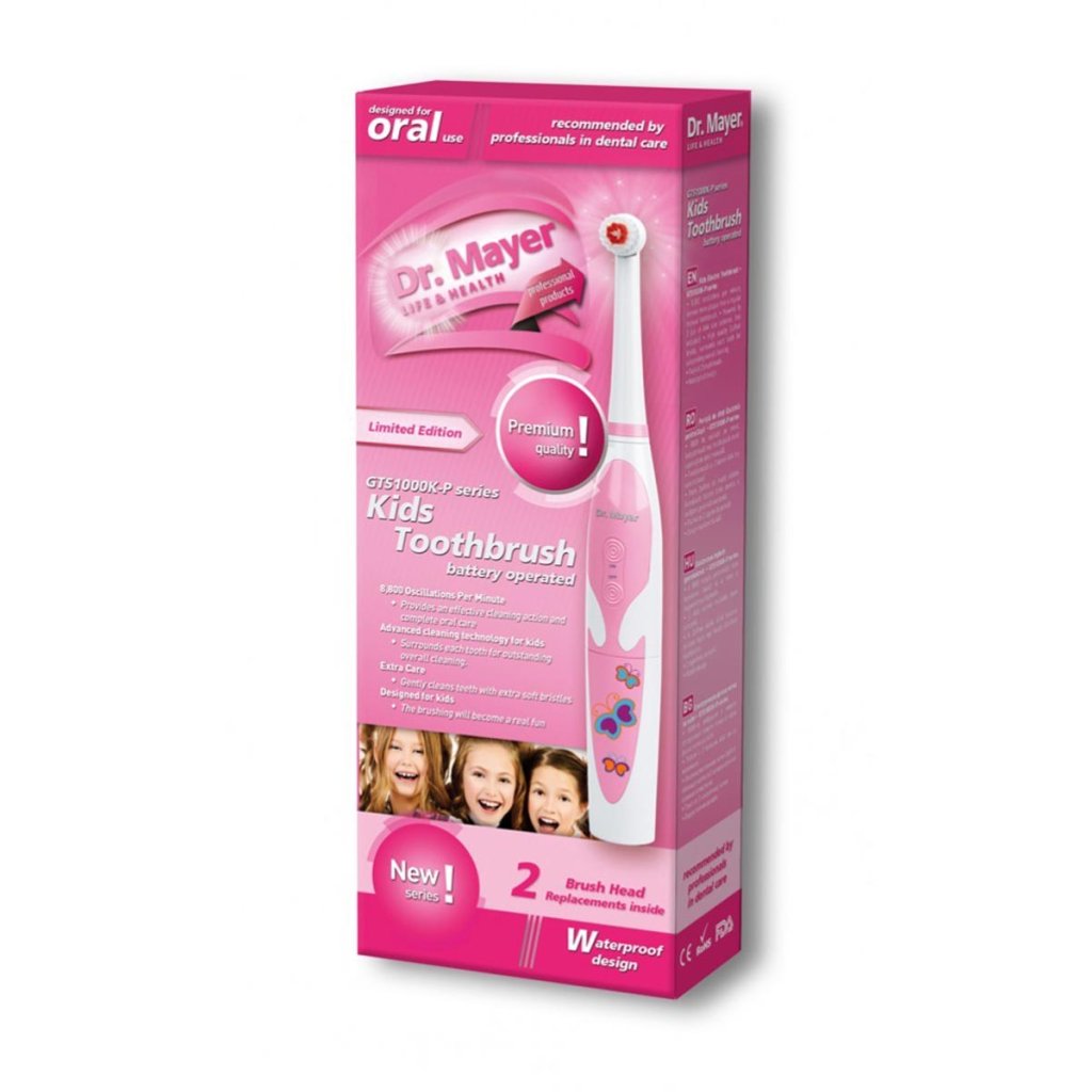 Detská zubná kefka DR. MAYER GTS1000K, navrhnutá špeciálne pre detské zuby, dokonale, rýchlo a šetrne odstraňuje zubný povlak, zvyšky jedla a nečistoty. Mimoriadne jemné štetinky zabezpečujú maximálne šetrnú starostlivosť o detské zuby a ďasná. Jedinečné čistenie ústnej dutiny pozostáva z dokonalých oscilačných pohybov až 8800 za minútu. Vodotesné telo. Napájanie: 2 x AAA batérie (nie sú súčasťou balenia).Dodatočné parametre