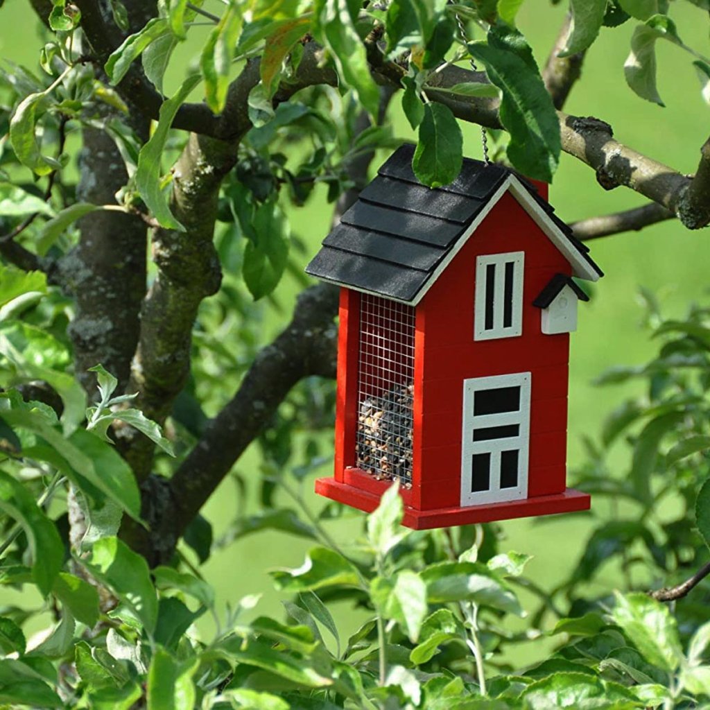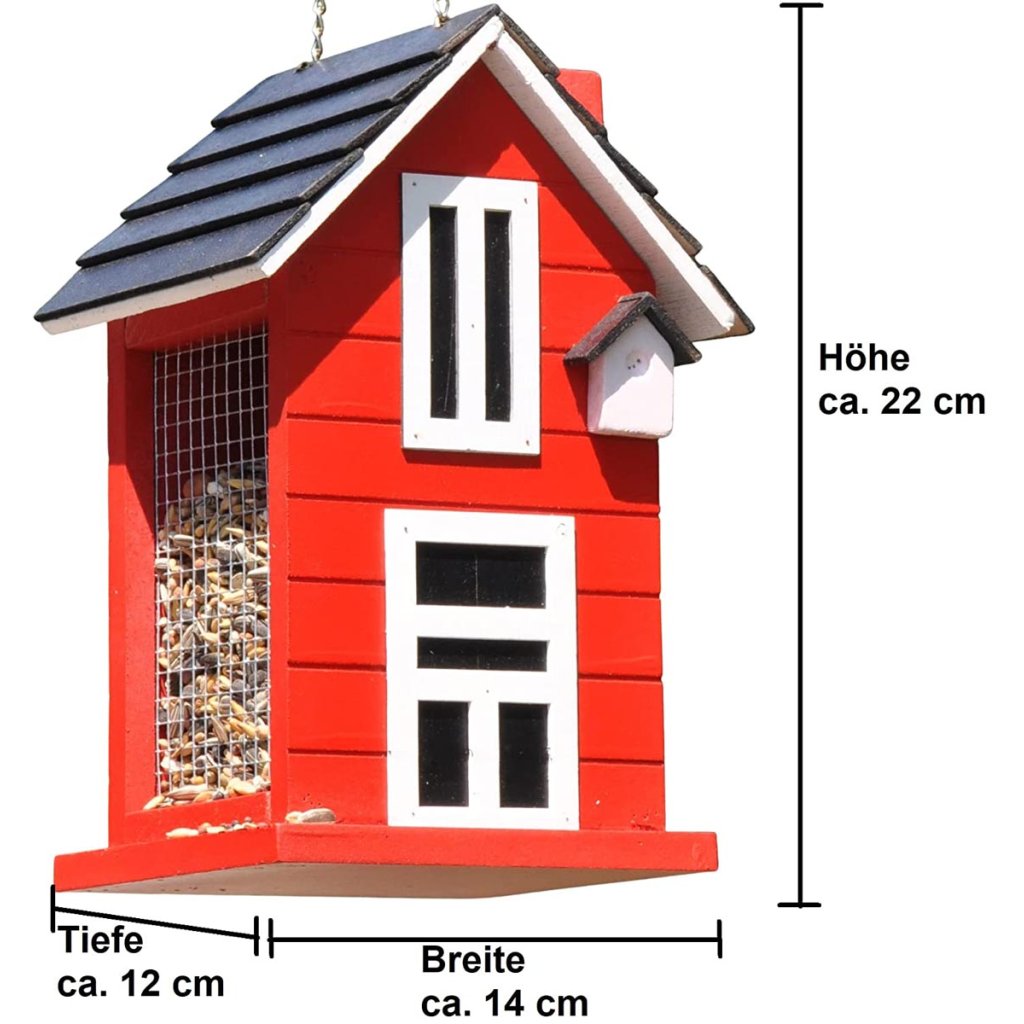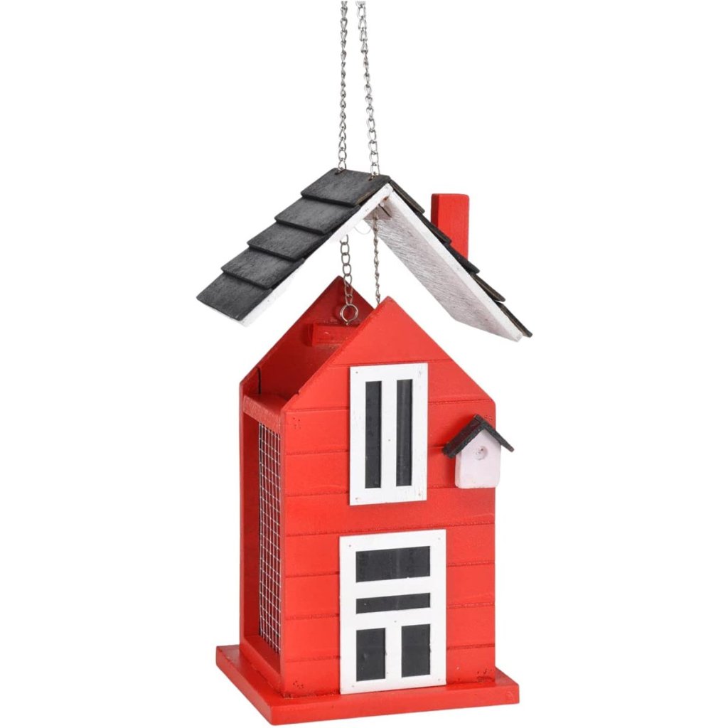 Červená vtáčia búdka s mnohými roztomilými detailmi. S otváracou strechou, ktorú možno ľahko naplniť potravou S reťazou na zavesenie.