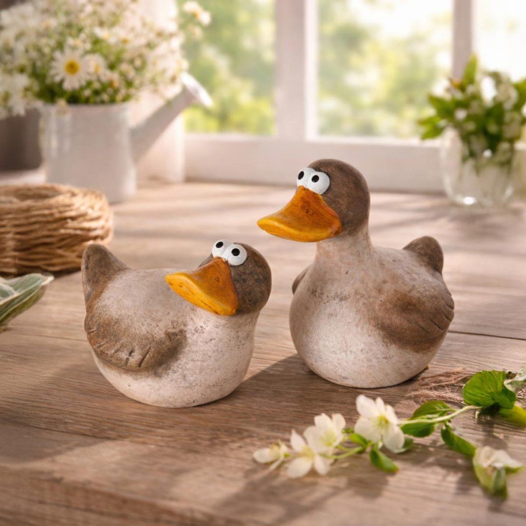 Roztomilá sada 2 dekoratívnych figúrok Timpy v tvare kačičiek vnesie do interiéru sviežosť a hravú atmosféru. Vďaka jemným prírodným farbám a roztomilému dizajnu sa dokonale hodia ako jarná dekorácia na poličku, komodu, parapet alebo sviatočne prestretý stôl. Figúrky tvoria krásne zladenú dvojicu a vyniknú samostatne alebo ako súčasť sezónneho aranžmánu.