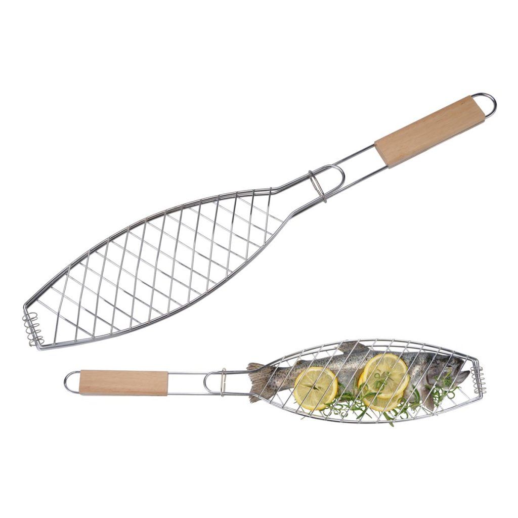 Dvojitý gril na ryby s drevenou rukoväťou uľahčuje grilovanie. Rybu zatvorte medzi 2 rošty roštu a zaistite ju proti otvoreniu poistným krúžkom. Grilovaný pokrm zostane na svojom mieste a dokonca sa dá otočiť pre lepšie prepečenie z oboch strán. Na celé ryby do 30 cm.