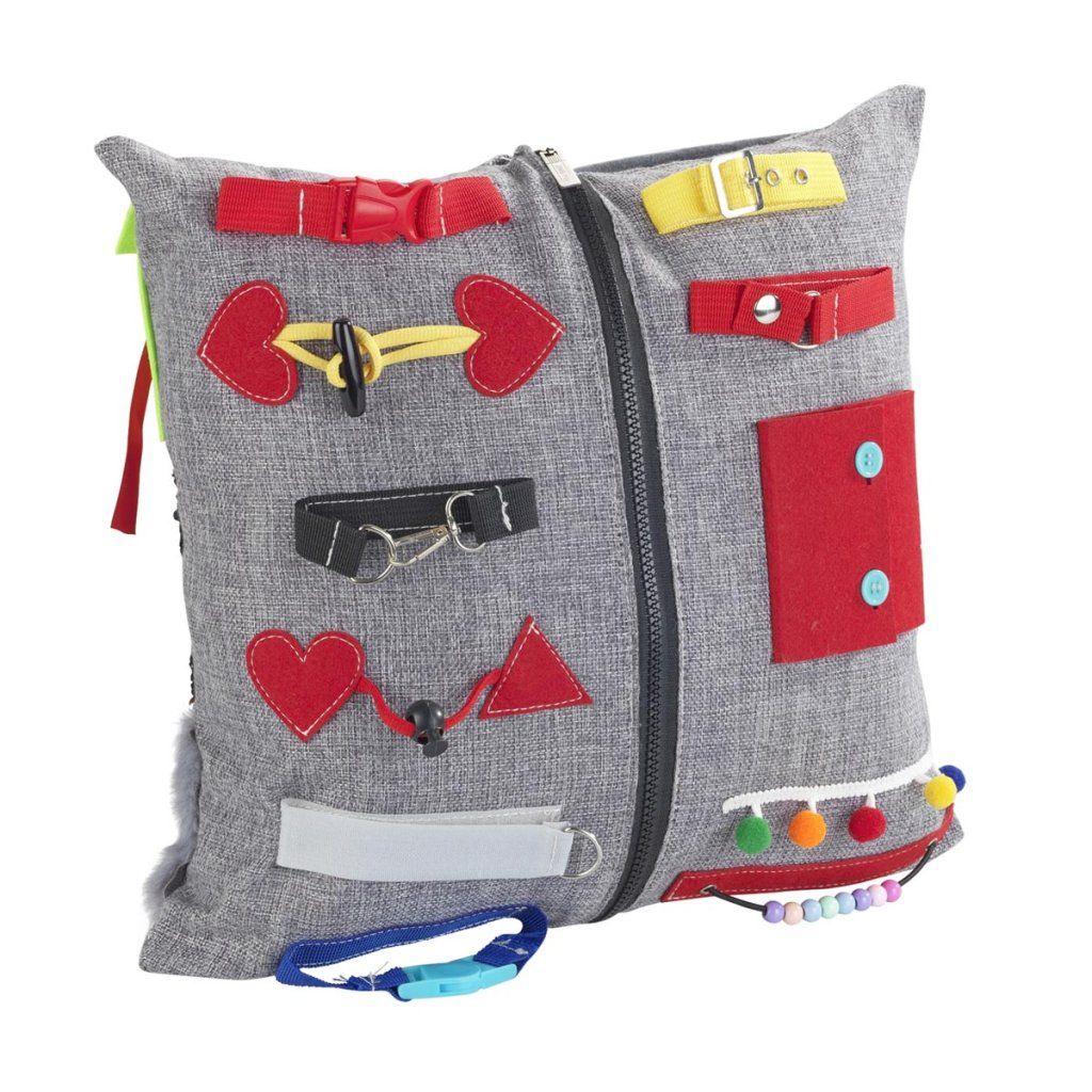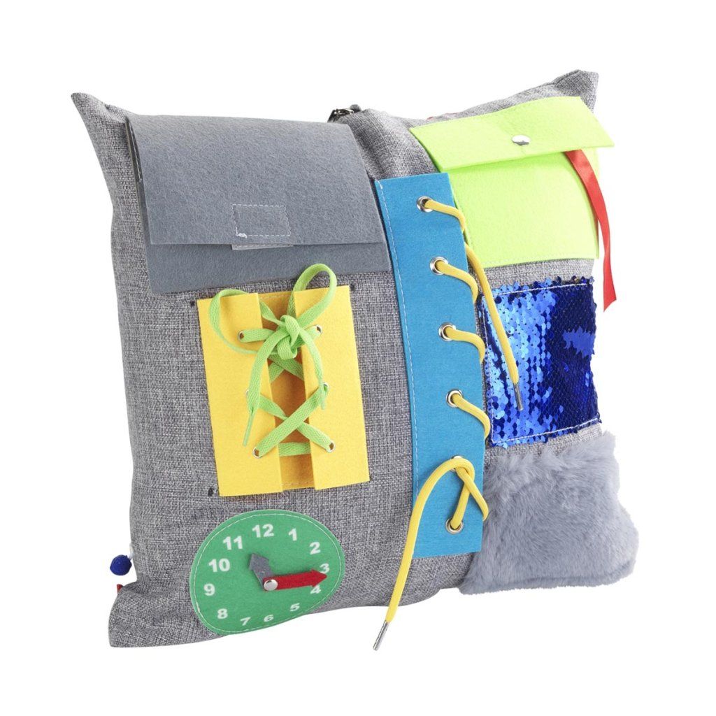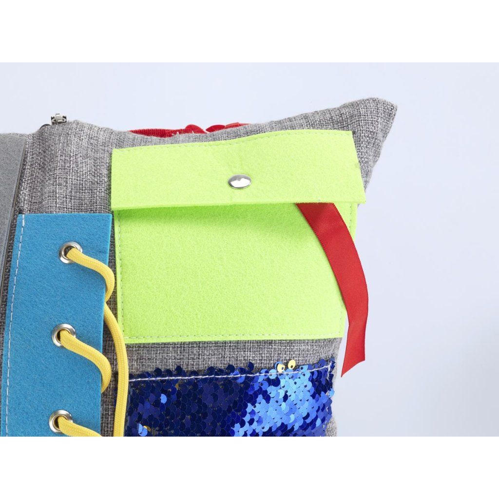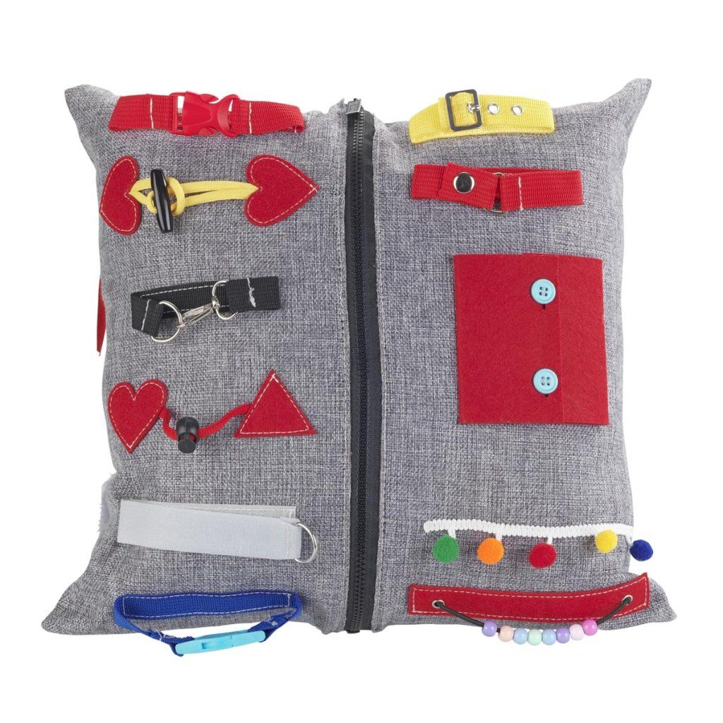 Vankúš obsahuje rôzne interaktívne prvky, ako sú zipsy, gombíky, stuhy alebo časti látky s rôznymi textúrami. Tieto aktivity podporujú motorické zručnosti rúk, koordináciu a jemné vnímanie. Pravidelné používanie môže pomôcť znížiť nepokoj, stres a úzkosť a zároveň prirodzene stimulovať zmysly.
