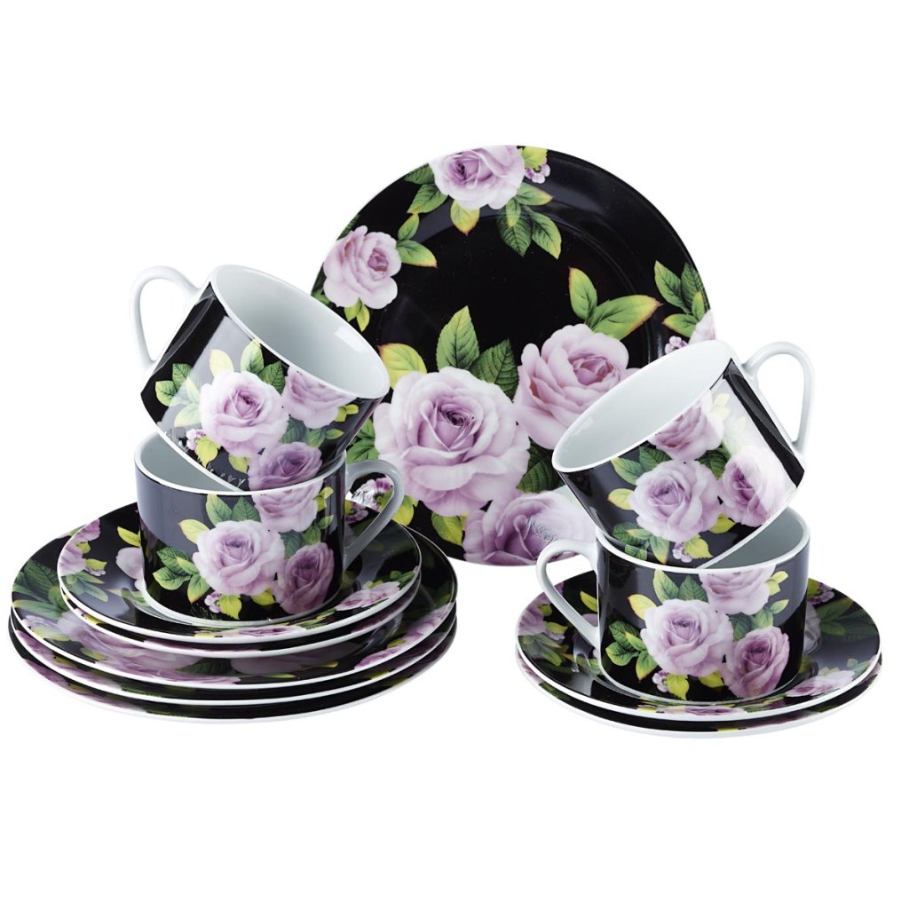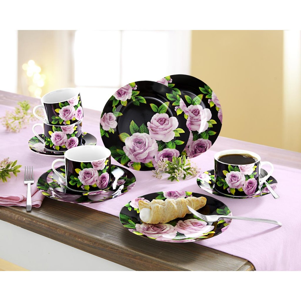 Krásny porcelánový servis s romantickým vzorom ruží na sýtom čiernom pozadí očarí na každom stole. Takto servírovaná káva a dezert zapôsobia na všetky zmysly!