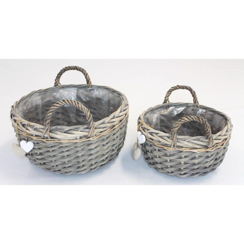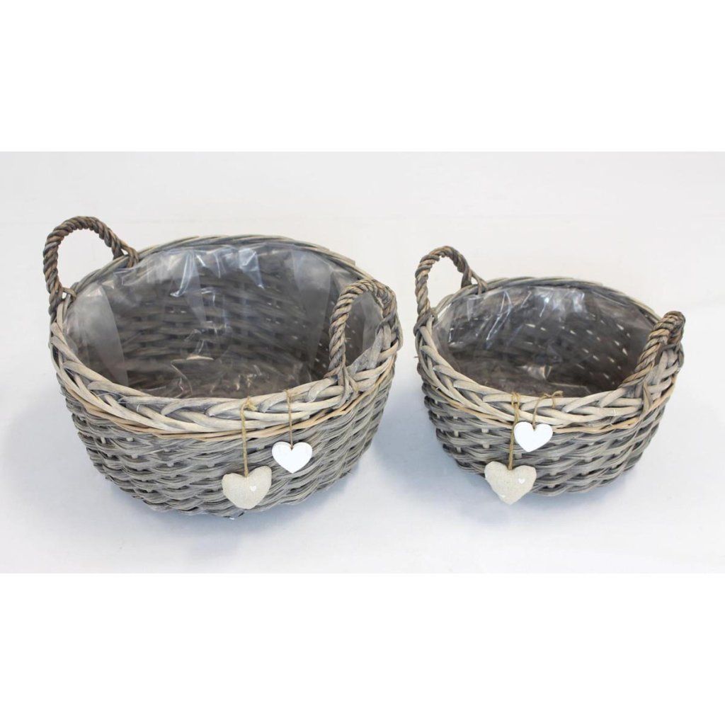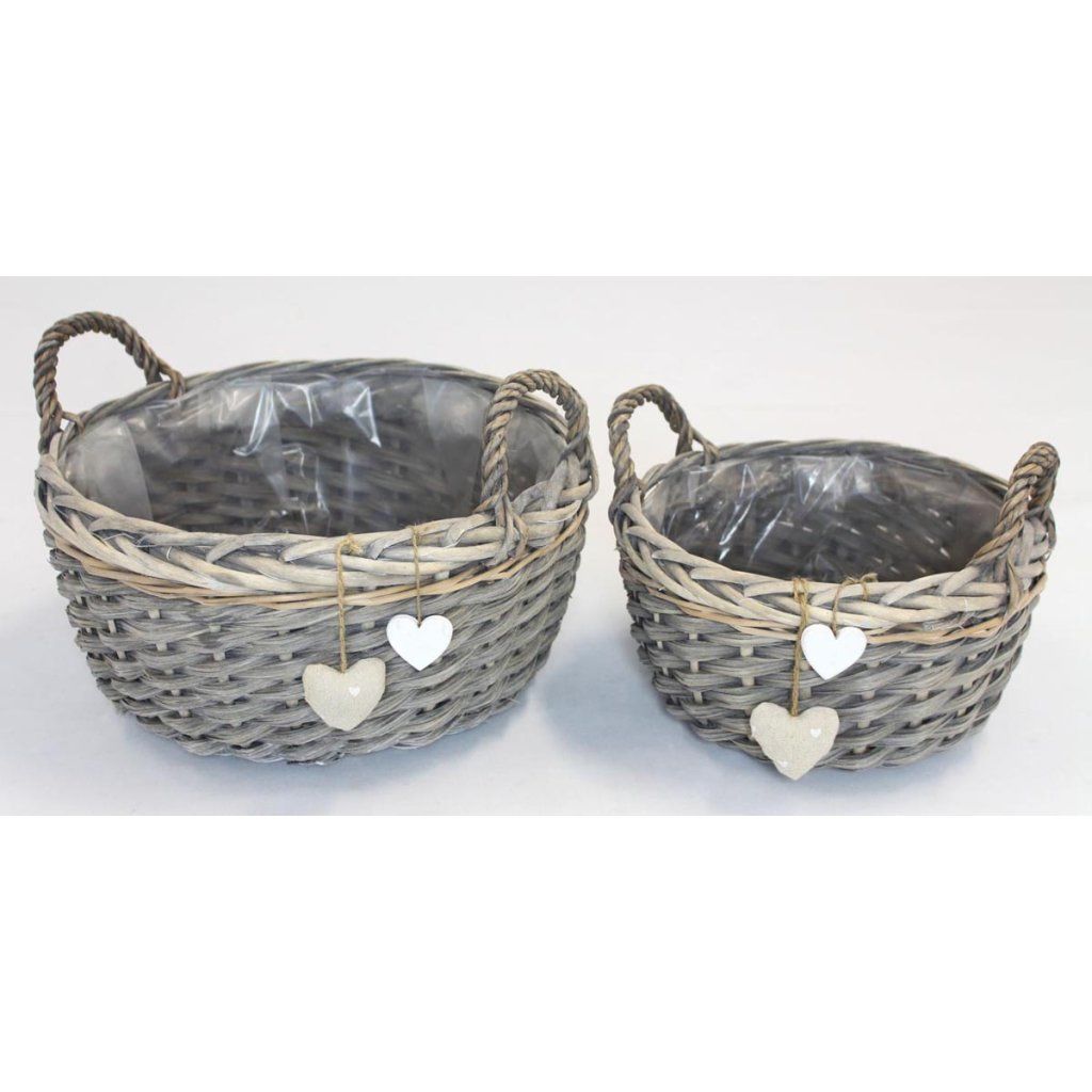 Stabilný výplet je doplnený ozdobnými srdiečkami z textilu a bieleho dreva, ktoré vytvárajú útulnú a nežnú atmosféru. Vďaka vnútornej fólii je ideálny ako kontajner na kvetináče alebo na priame sadenie.