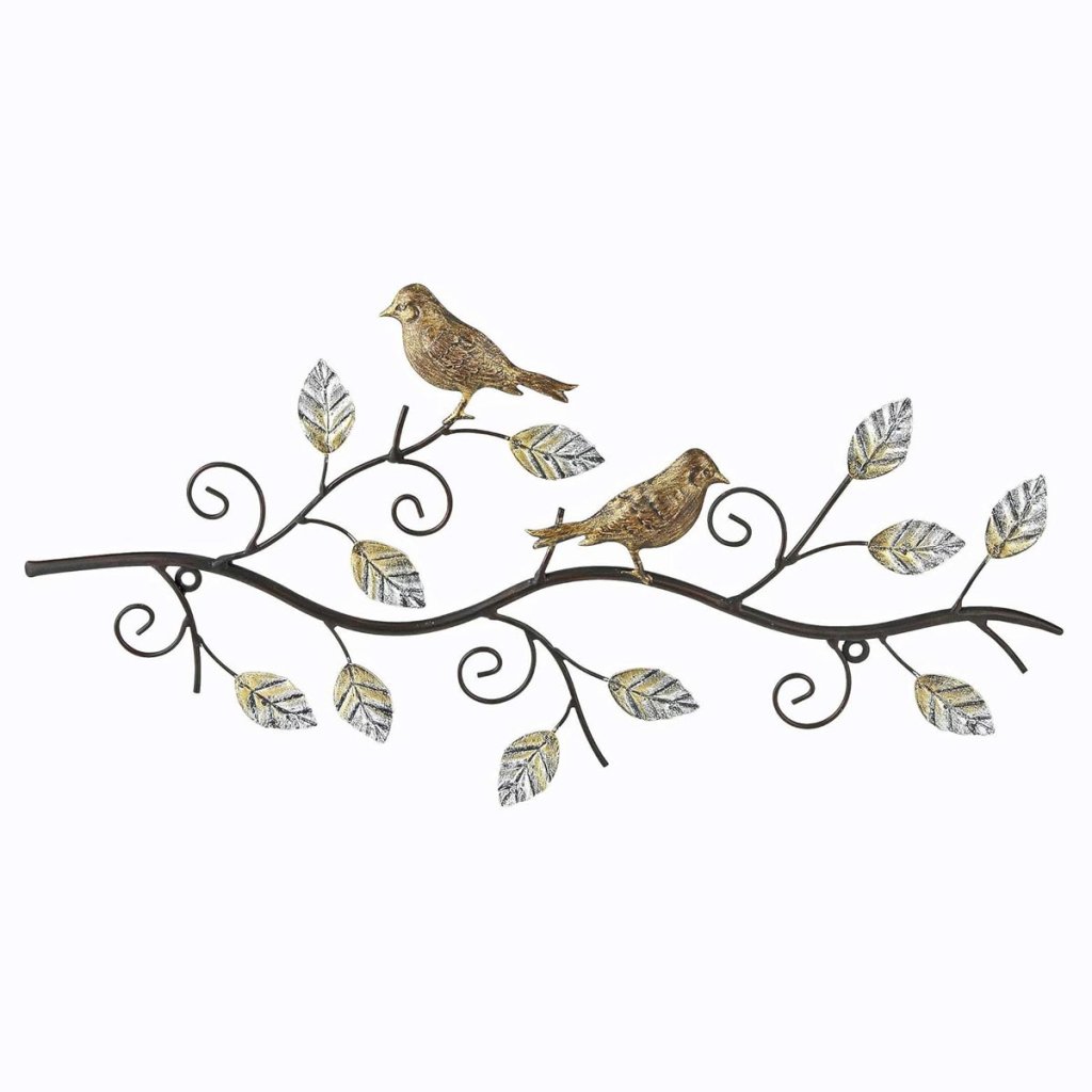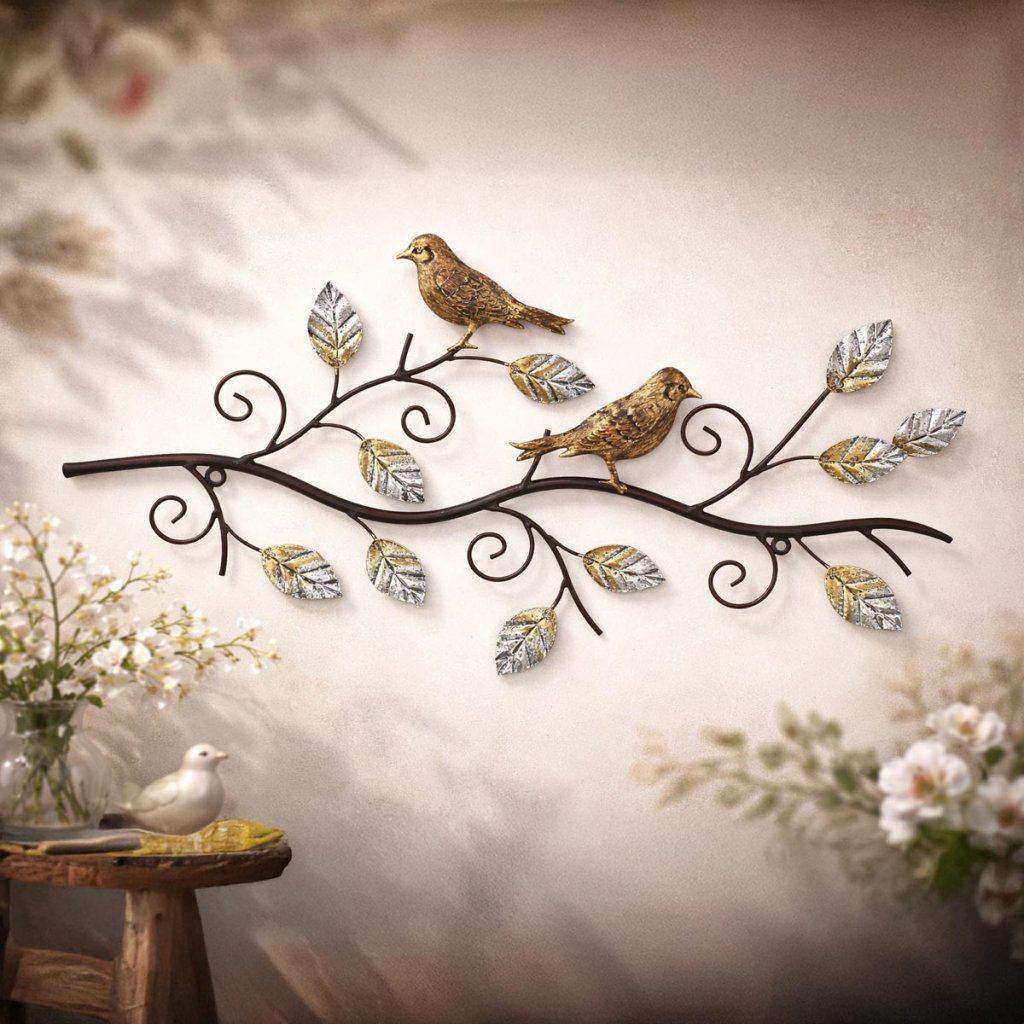 Krásne nástenné dekorácia dvoch vtáčikov na konáre s listami. Vtaciky sú v zlatej farbe. Lístky v jemnej strieborno zlatej. Tento kontrast dodá elegantný nádych každej stene.