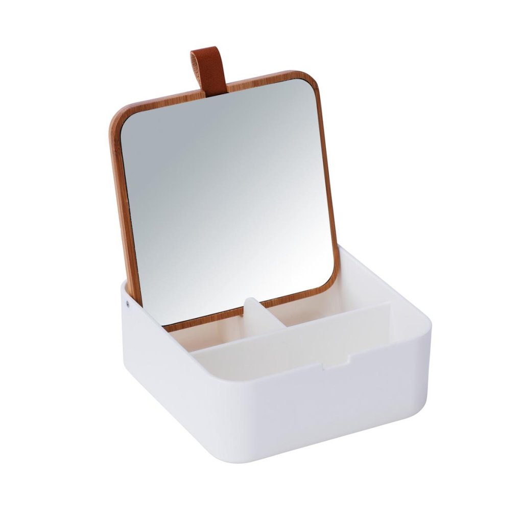 Kombík, ktorý vôbec nie je obyčajný. Je to sofistikovaný organizér na kozmetiku so zrkadlom Wenko. Štýlový a jednoduchý dizajn umožňuje umiestniť organizér do akejkoľvek miestnosti vášho domova. Vnútro organizéra je rozdelené na 3 časti. Môžete do nich uložiť kozmetiku, samotnú kozmetiku, lak na nechty, šperky, pinzetu, štetce atď. Veko má pútko na jednoduché otváranie a na druhej strane veka je zrkadlo, ktoré môžete do boxu ľahko pripnúť, aby ste sa pri vykonávaní kozmetických úkonov videli. Organizér je pripravený poslúžiť vám nielen doma, ale aj na cestách.