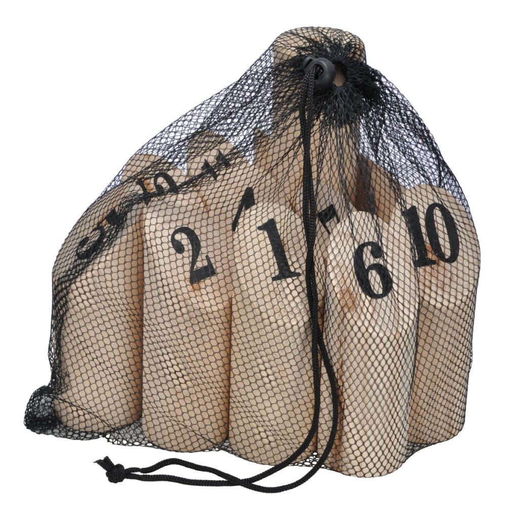 V sade 12 kolíkov s číslami Ø 5,2 x 15 cm a jeden házací kolík Ø 33 x 34 cm. Materiál: drevo.