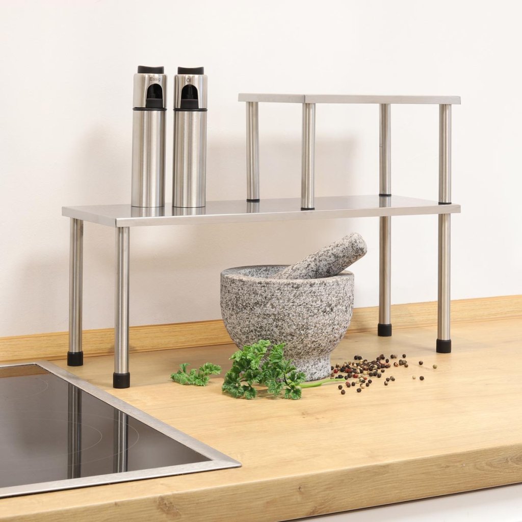 Dvojposchodová polica z nehrdzavejúcej ocele je praktickým šetričom miesta a elegantným doplnkom kuchynskej linky.