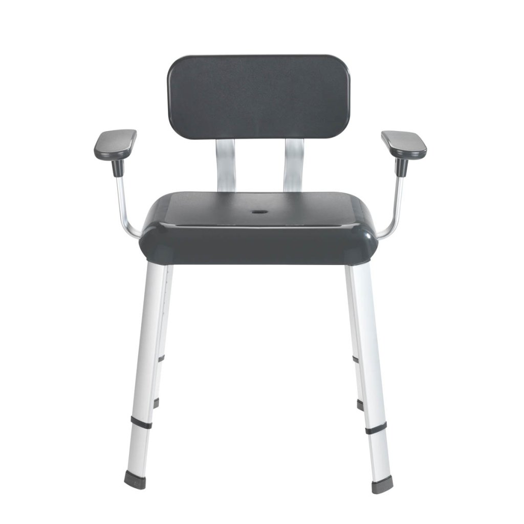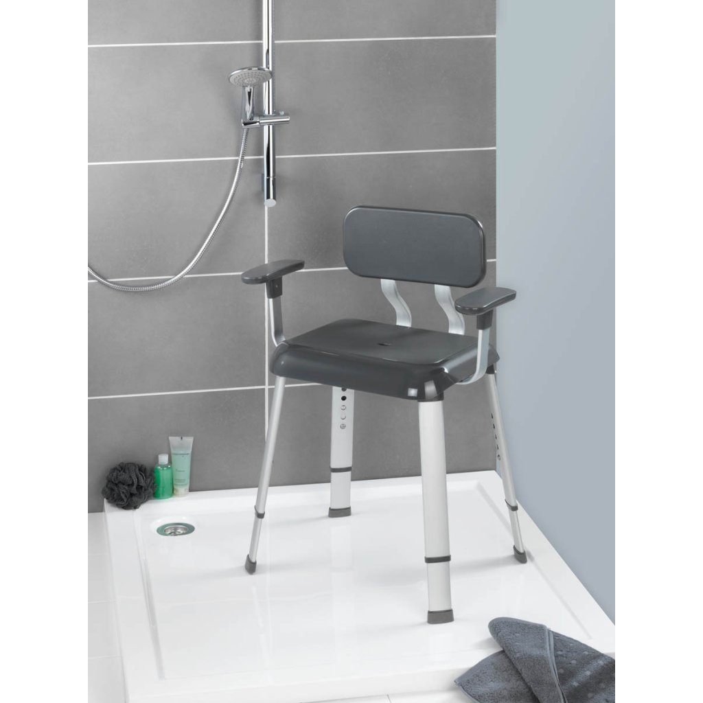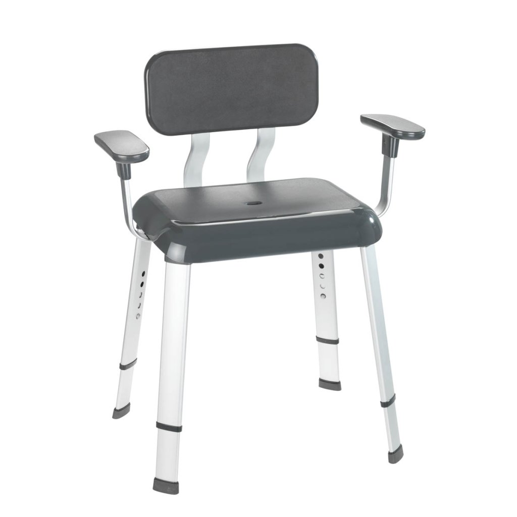 Robustná stolička s opieradlom a prídavnými podrúčkami zaisťuje väčšie potešenie z kúpania a bezpečnosť. Vďaka štyrom stabilným hliníkovým nohám s protišmykovými plastovými krytkami stojí praktická stolička vždy bezpečne na podlahe. Zároveň má nosnosť až 130 kg . Stolička má protišmykový, textúrovaný a veľmi veľký povrch sedadla pre ešte väčšie pohodlie a bezpečnosť. Pohodlné sedadlo má veľký otvor, ktorý umožňuje úplný odtok vody. Protiskluzový textúrovaný chrbát a podrúčky poskytujú bezpečnú oporu a usnadňujú vstávanie. Štýlové nožičky sú výškovo nastaviteľné do 5 poloh pre optimálnu polohu pri sprchovaní.