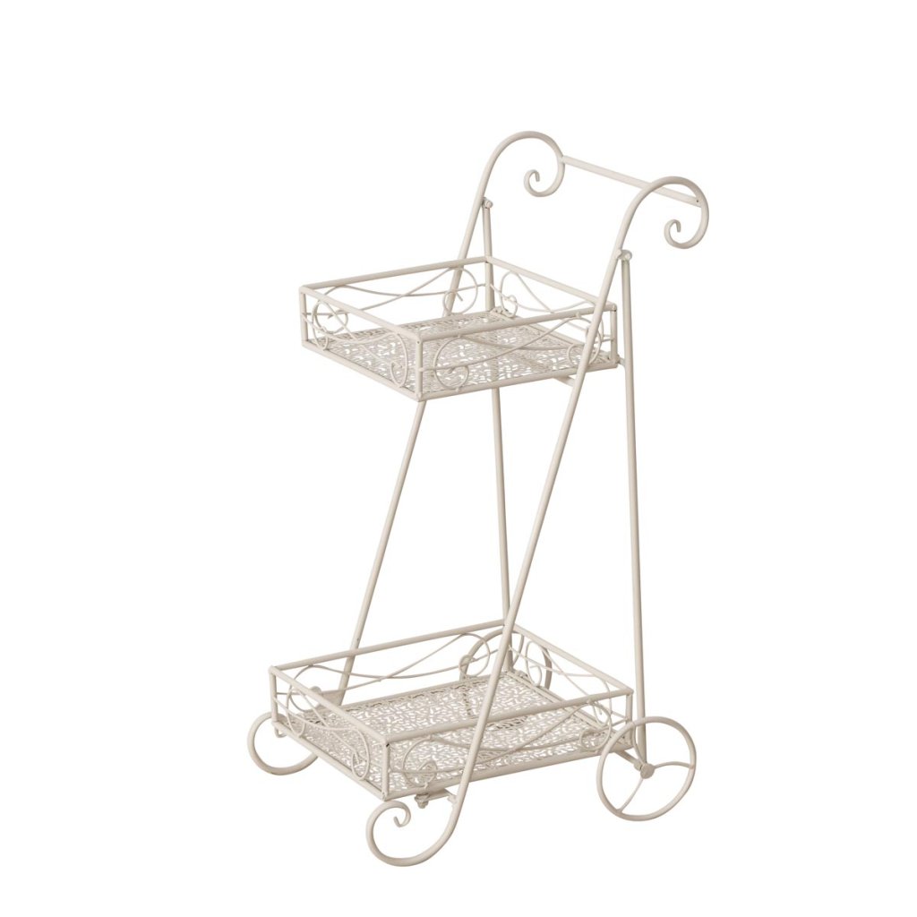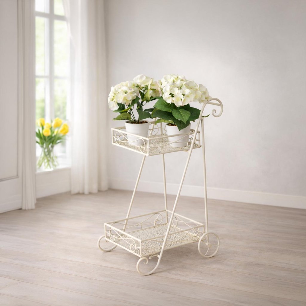 Tento dekoračný stojan ponúka dve poličky na prehľadné usporiadanie kvetov, lampášov alebo drobných doplnkov. Ako patio stojan na kvety je ideálny na vytvorenie útulného zákutia a umožňuje vystaviť rastliny v rôznych výškach pre atraktívne aranžmány.