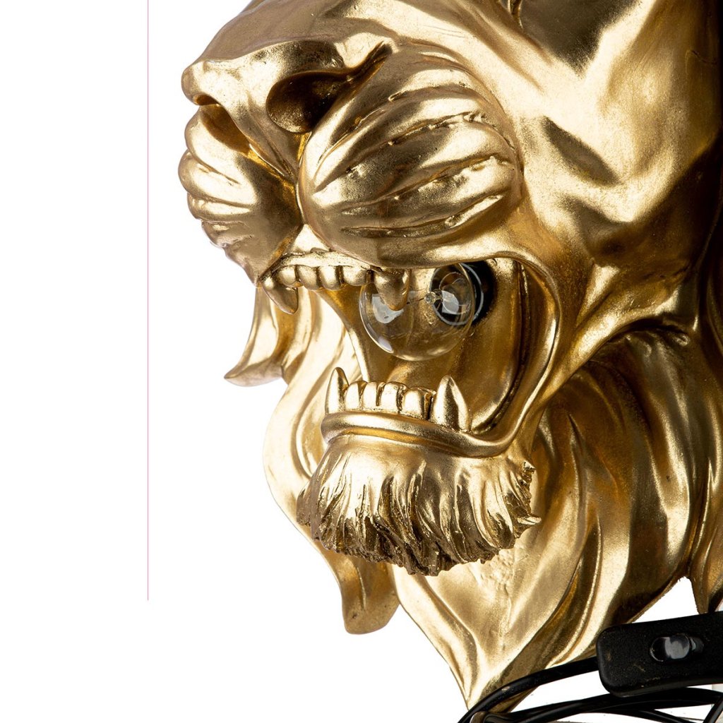 Originálna nástenná lampa v tvare hlavy leva so zlatou povrchovou úpravou sa stane výraznou dominantou každého interiéru. Detailný motív dodáva priestoru luxusný a mierne industriálny charakter a dokonale sa hodí do moderných a extravagantných interiérov, obývačky, pracovne alebo štýlového baru. Telo lampy je vyrobené zo syntetickej živice, ktorá zaručuje pevnosť a odolnosť. Svetelný zdroj sa vkladá z bočnej strany otvoru a je určený výlučne pre LED žiarovky s menším priemerom. Vďaka dlhému káblu ponúka flexibilné umiestnenie.