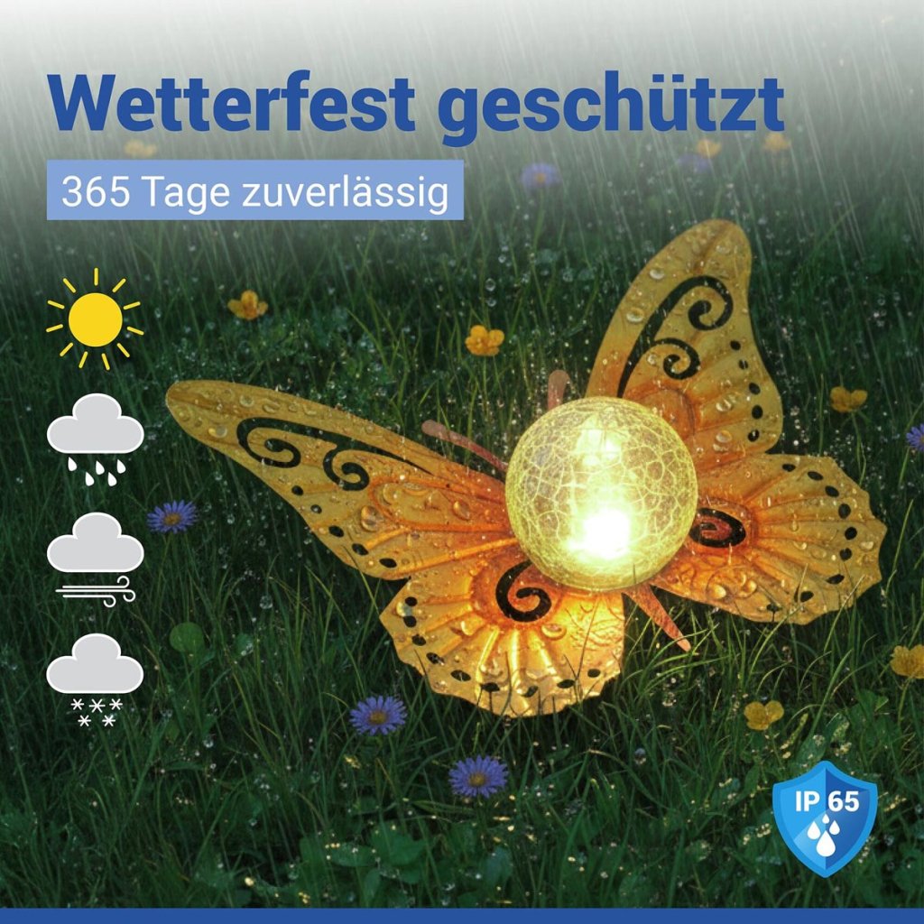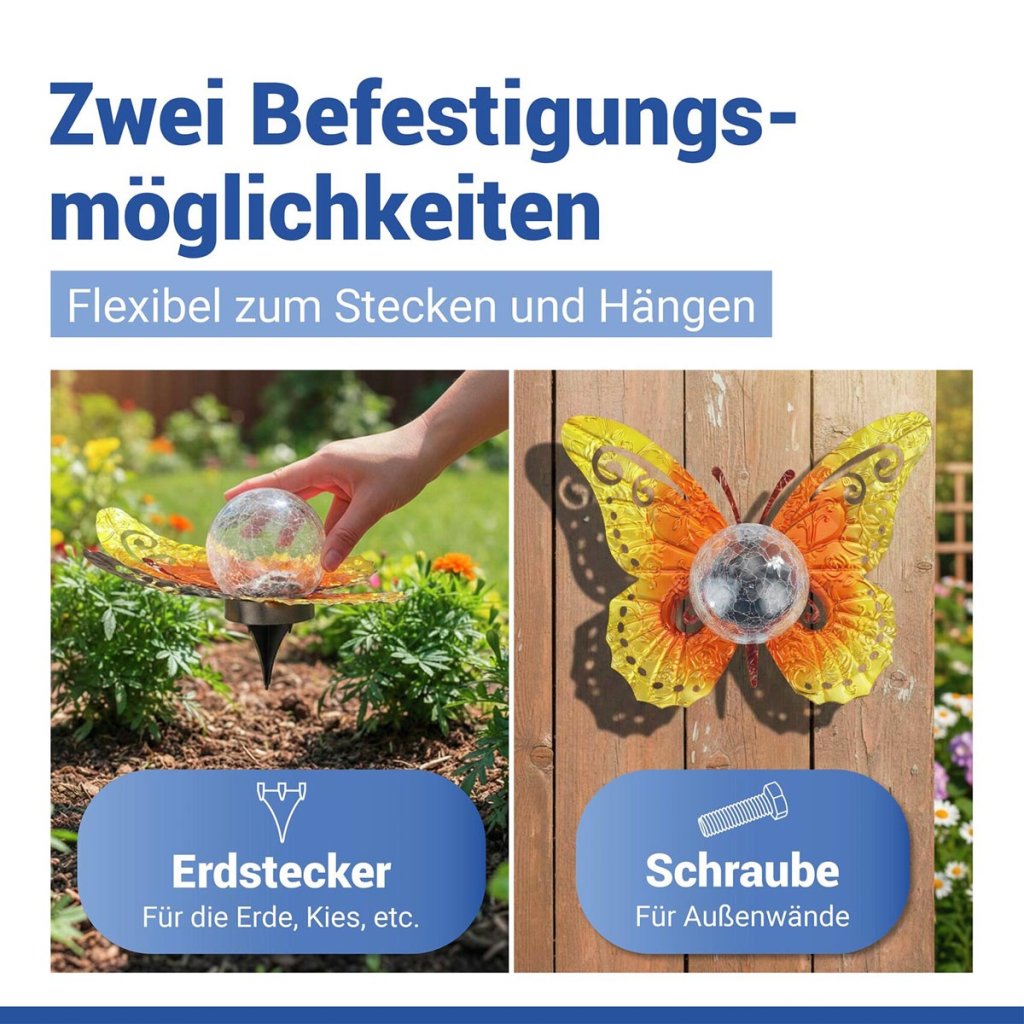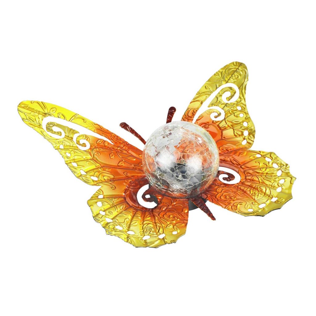 Táto originálna LED dekorácia v tvare motýľa je krásna dekorácia do záhrady, ktorá vytvorí príjemnú atmosféru počas večerného stretnutia. Svietiaca sklenená guľa jemne zvýrazňuje motív motýľa a dodáva priestoru teplý svetelný akcent.