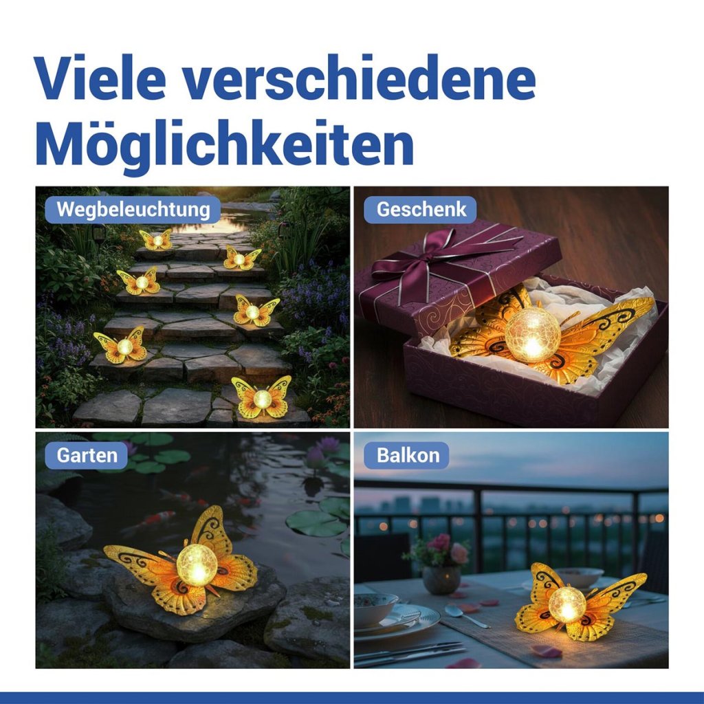 Táto dekorácia motýľa je vhodná na záhony, trávniky, pozdĺž záhradných chodníkov a do kvetináčov na terasy alebo balkóny. Vytvára jemné večerné osvetlenie a slúži aj ako výrazná záhradná ozdoba.