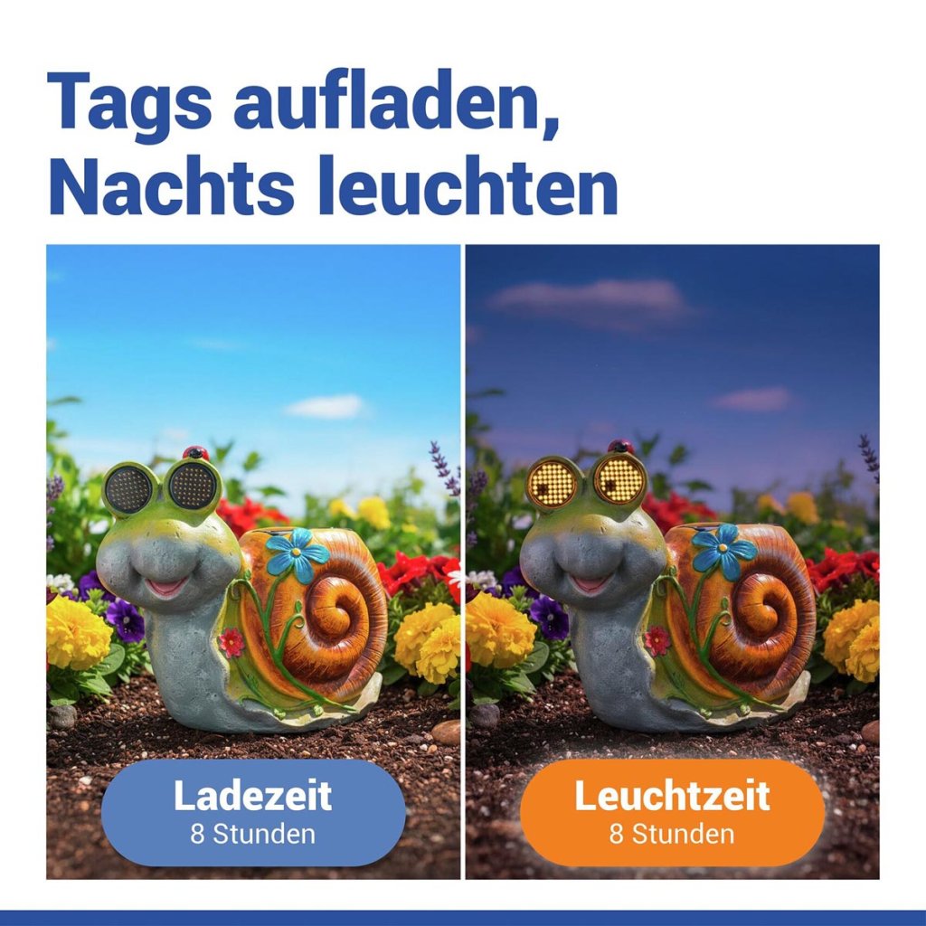 Roztomilá dekorovaná socha je originálna záhradná dekorácia, ktorá oživí záhon, terasu alebo balkón. Počas dňa sa figúrka nabíja solárnym panelom a po zotmení sa automaticky rozsvietia jej oči LED, ktoré navyše efektne blikajú a vytvárajú hravý svetelný efekt.