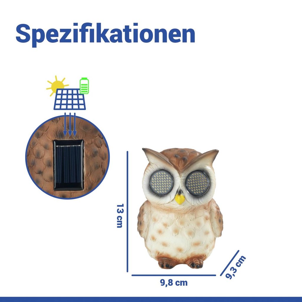 Roztomilá dekorovaná socha je originálna záhradná dekorácia, ktorá oživí záhon, terasu alebo balkón. Počas dňa sa figúrka nabíja solárnym panelom a po zotmení sa automaticky rozsvietia jej oči LED, ktoré navyše efektne blikajú a vytvárajú hravý svetelný efekt.