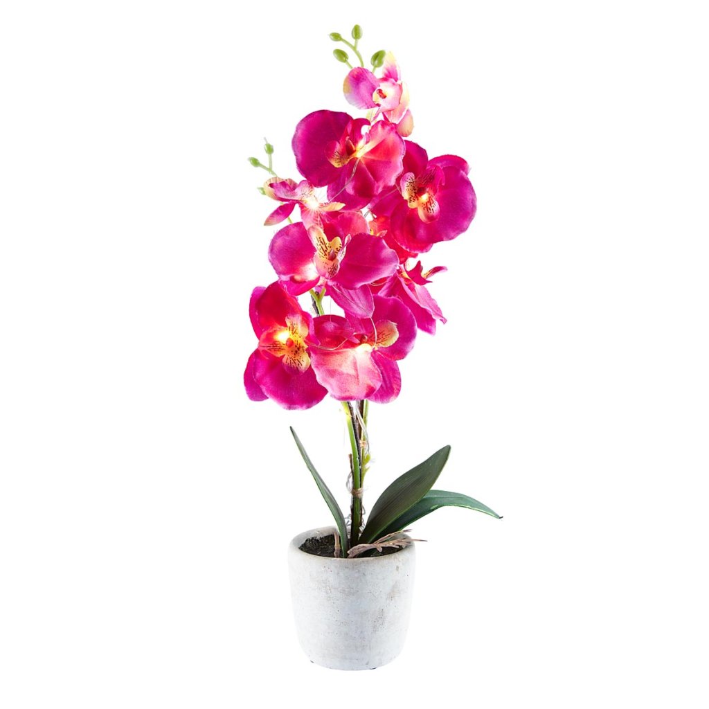 Krásna umelá orchidea v sametovo fialovej farbe nepotrebuje žiadnu starostlivosť, slnečné svetlo ani vodu a jej kvety vás budú tešiť po dlhú dobu. S osvetlením 10 LED diódami krásne žiari a vždy upúta pozornosť.