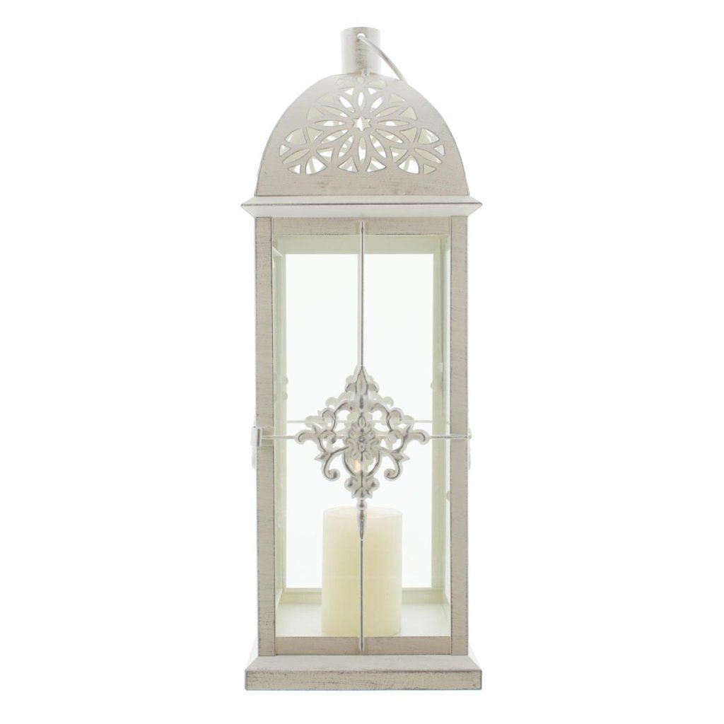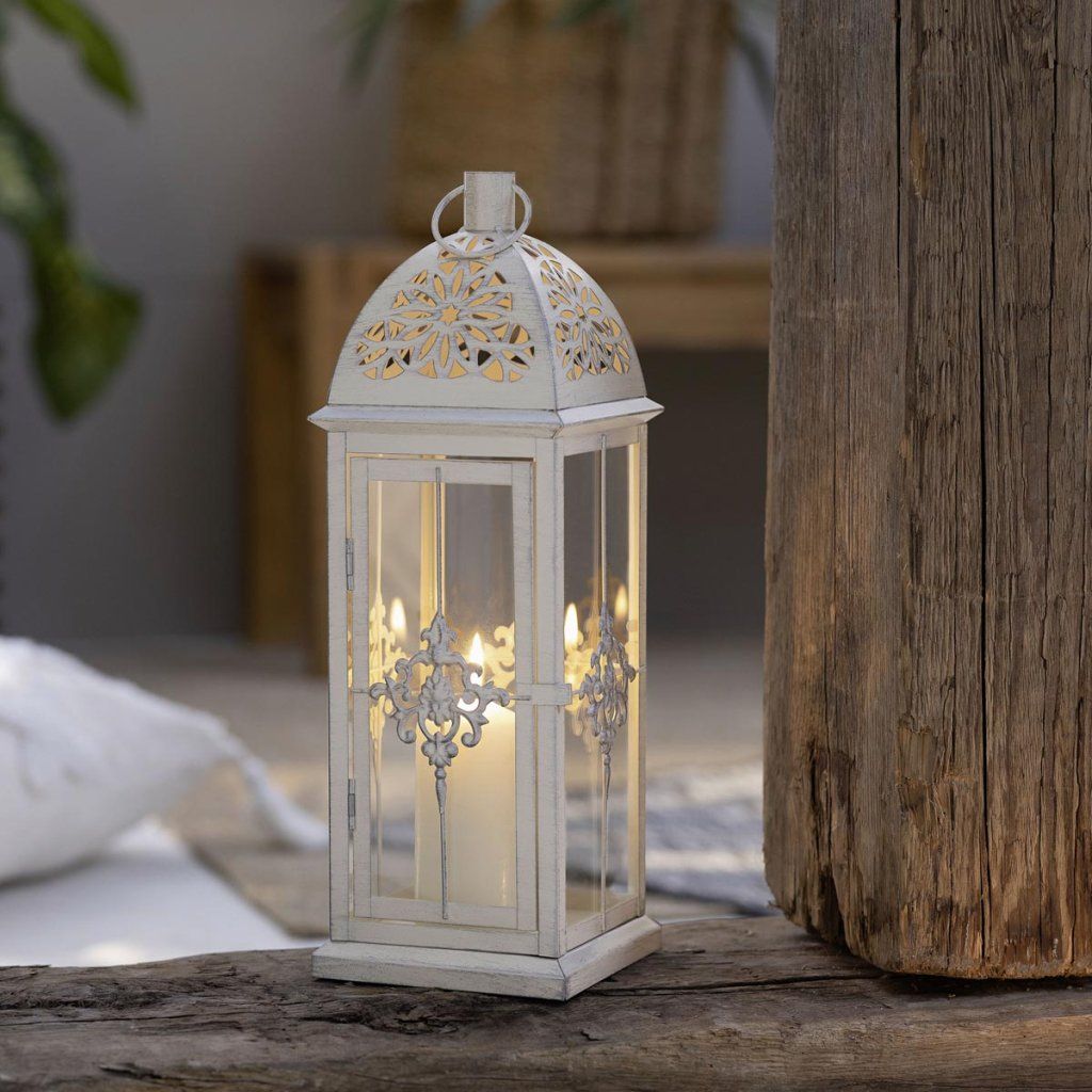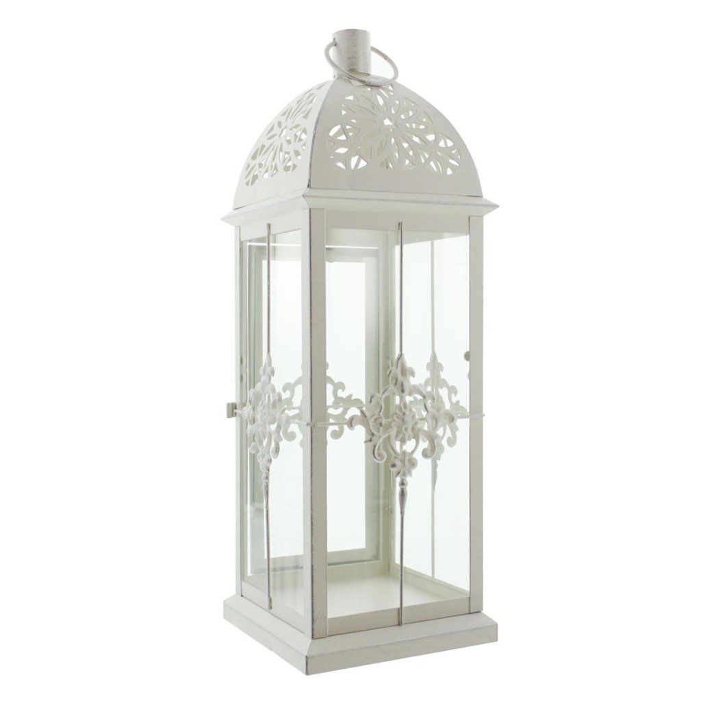 Táto elegantná kovová lampa v matnej bielej farbe zaujme svojím jemným dizajnom a romantickým vzhľadom. Povrch s ľahkou striebornou patinou dodáva lampášu vintage nádych a zdôrazňuje jeho dekoratívnosť.