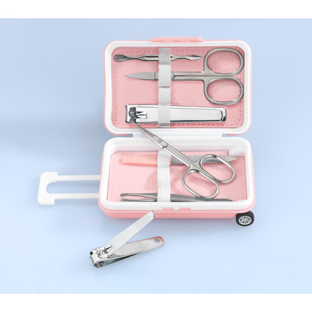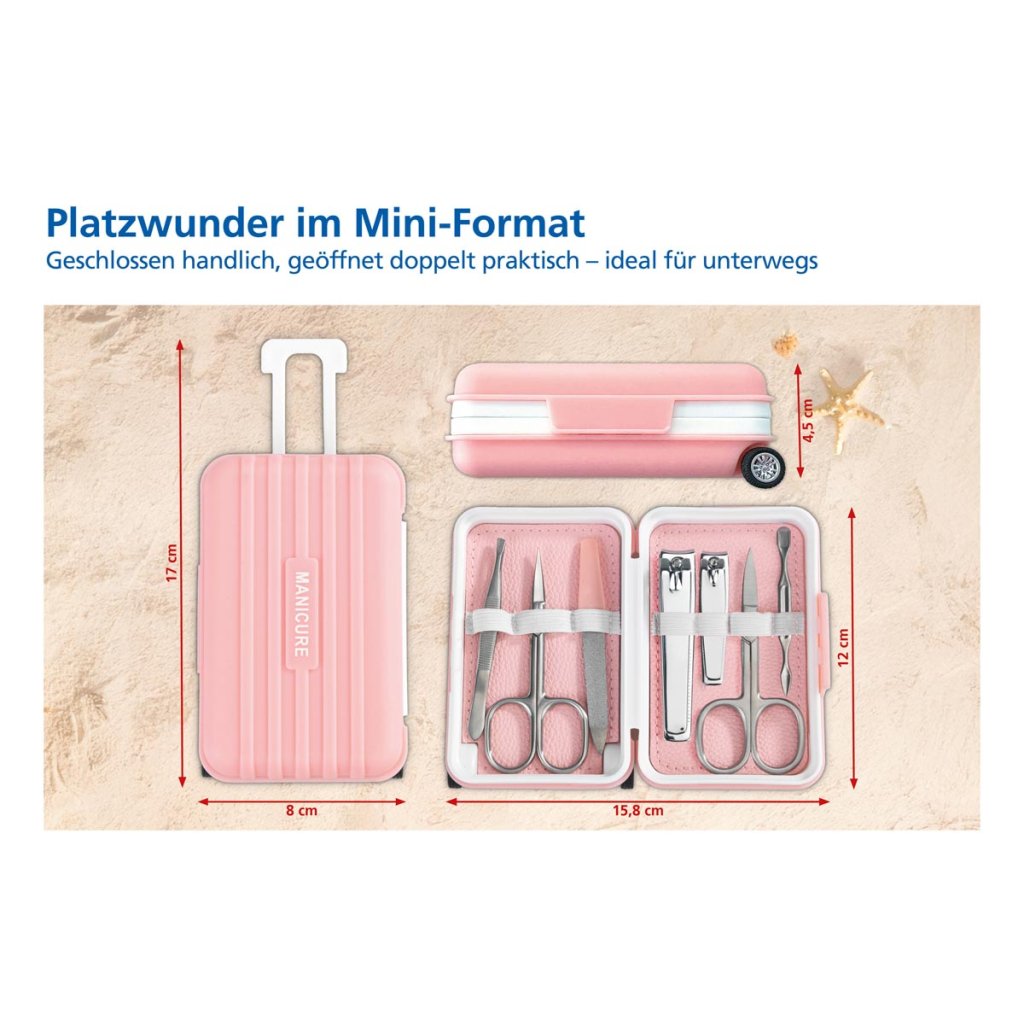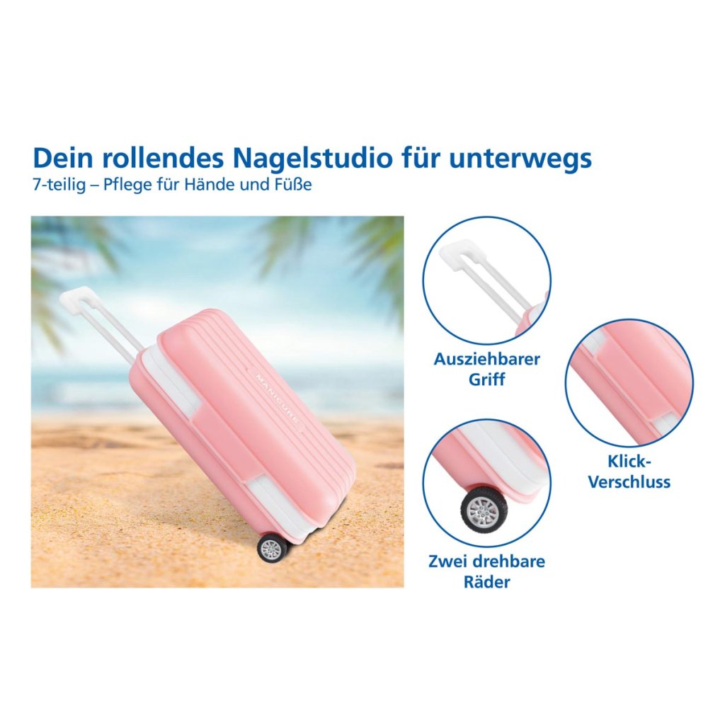 Táto štýlová manikúra v puzdre spája praktickú starostlivosť o nechty s hravým dizajnom, ktorý zaujme na prvý pohľad. Kufrík v tvare ružového minikufríka s bielymi detailmi a kolieskami vyzerá ako skutočný cestovný kufrík. Pevný uzáver na zaklapnutie zaručuje bezpečné uloženie všetkých nástrojov.