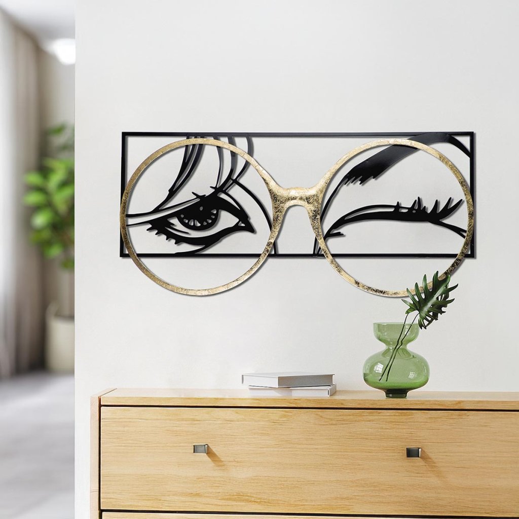 Dekorácia na stenu Twinkle je pôsobivá kovová dekorácia v elegantnom lesklom čiernom vyhotovení s výraznými zlatými detailmi na sklách. Tento moderný dizajnový prvok dodá výrazný charakter každému interiéru - či už visí v obývacej izbe, predsieni, kancelárii alebo na chodbe. Minimalistické, ale výrazné stvárnenie očí a okuliarov vytvára pôsobivý 3D efekt, ktorý upúta pozornosť a stane sa štýlovým akcentom na stene. Vďaka kombinácii čiernej a zlatej farby sa reliéf ľahko kombinuje s rôznymi dekoratívnymi štýlmi a farebnými schémami.