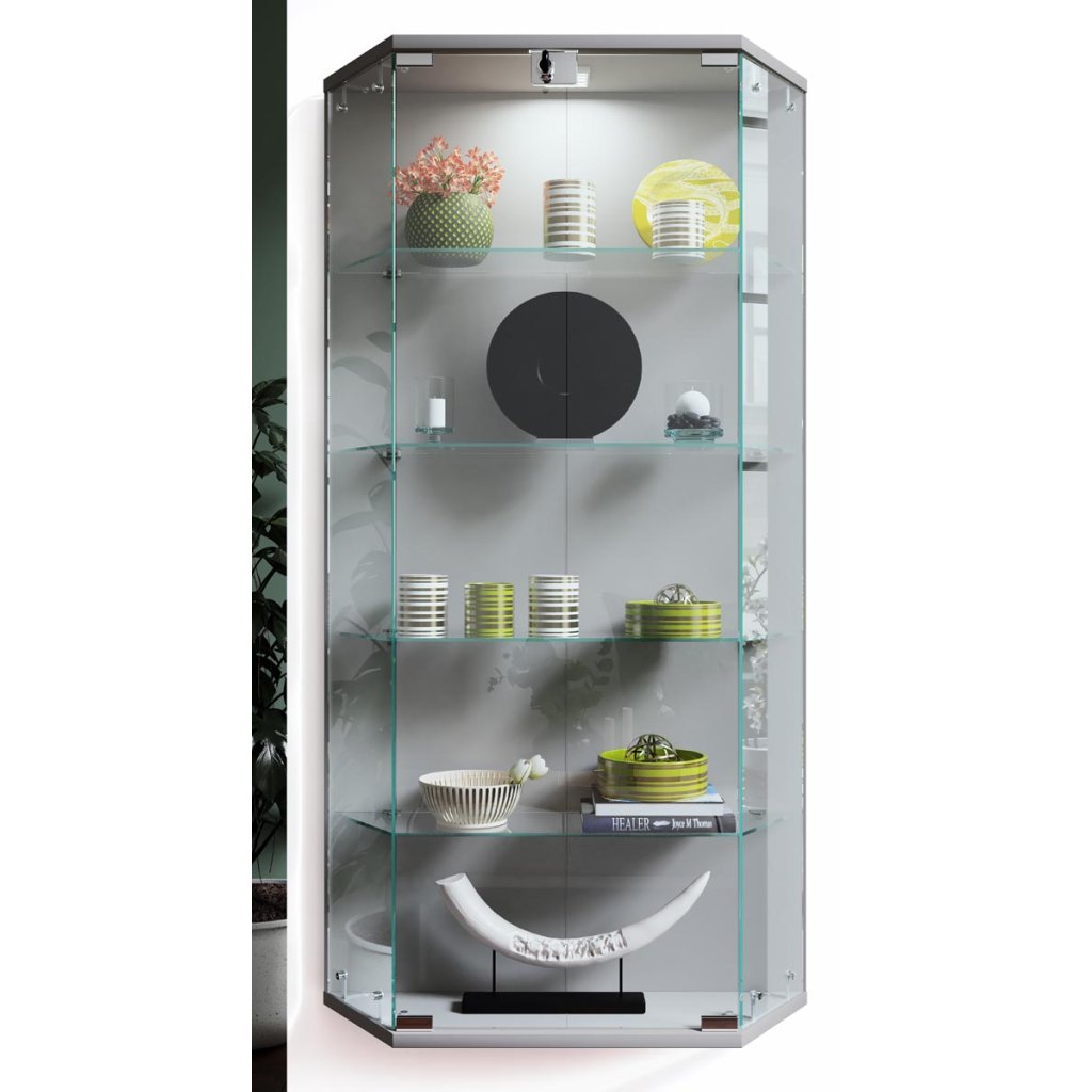 Hlavné vlastnosti: - 4 sklenené police - Individuálne nastaviteľné police - Vitrína s dvoma otočnými dvierkami - Uzamykateľná na dva kľúče - Voliteľné osvetlenie - Rozmery: V 114 x Š 83 x H 17 cm Vitrína má lichobežníkový tvar, ktorý jej dodáva osobitý vzhľad. Nastaviteľné sklenené police možno kedykoľvek posúvať podľa individuálnych potrieb. Tento krásny kus nábytku dopĺňajú dvoje plynulo otvárateľné dvierka. Dizajnér vytvoril estetiku, vďaka ktorej sklenená vitrína zaujme takmer v každej miestnosti.Dodatočné parametre