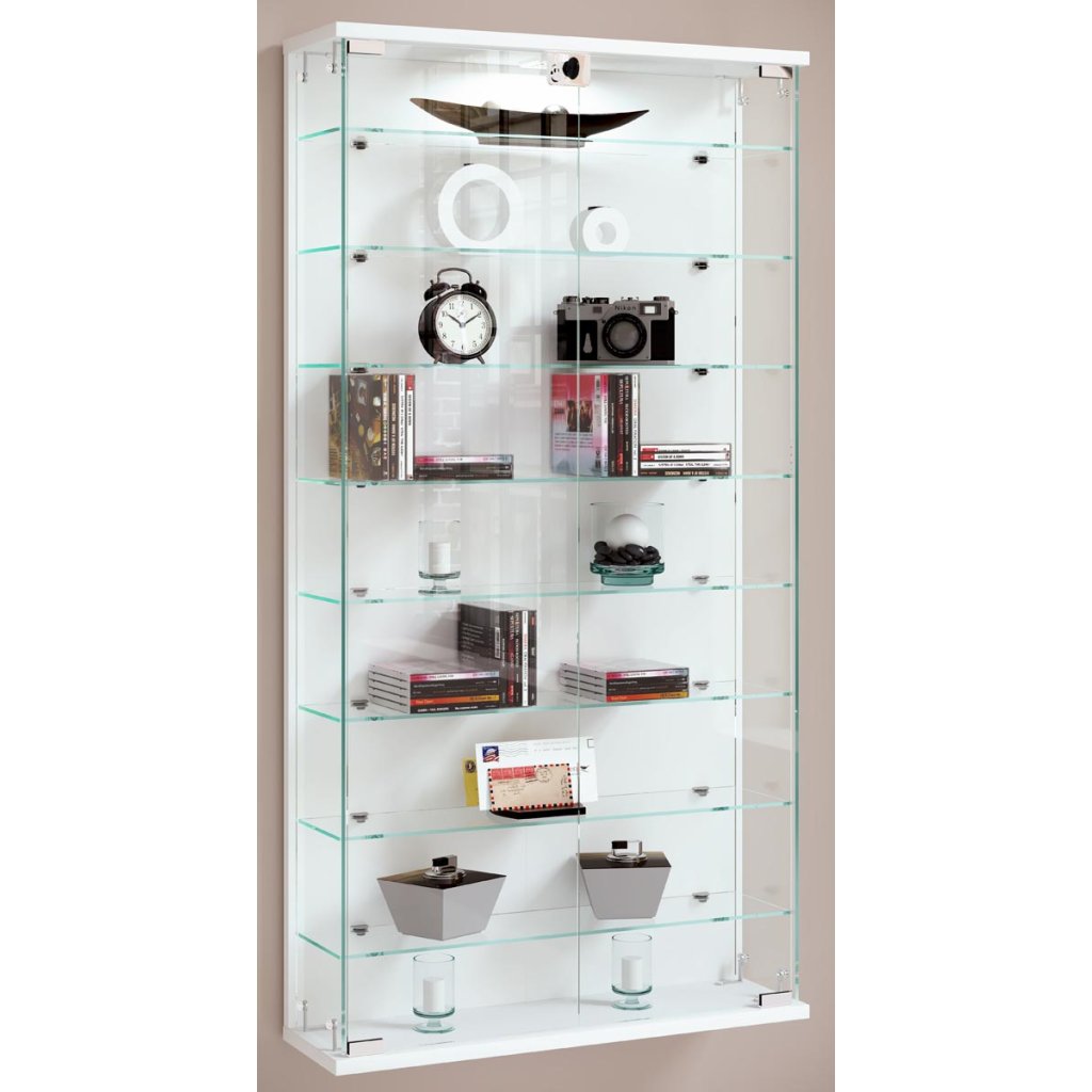 Hlavné vlastnosti: - 8 sklenených políc - Individuálne nastaviteľné police - Vitrína s dvoma otočnými dvierkami - Uzamykateľná na dva kľúče - Voliteľné osvetlenie - Rozmery: V 114 x Š 59 x H 17 cm Vitrína má lichobežníkový tvar, ktorý jej dodáva osobitý vzhľad. Nastaviteľné sklenené police možno kedykoľvek posúvať podľa individuálnych potrieb. Tento krásny kus nábytku dopĺňajú dvoje plynulo otvárateľné dvierka. Dizajnér vytvoril estetiku, vďaka ktorej sklenená vitrína zaujme takmer v každej miestnosti.Dodatočné parametre