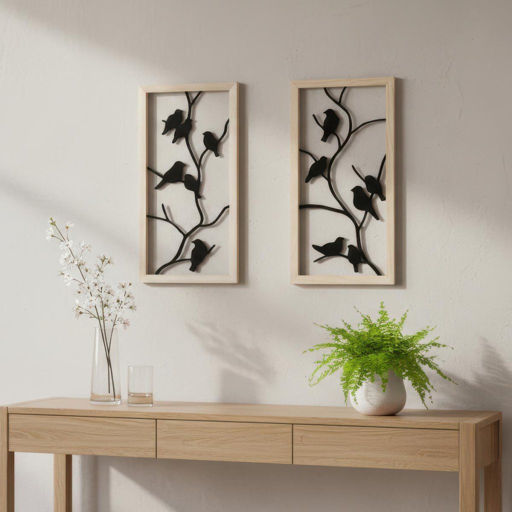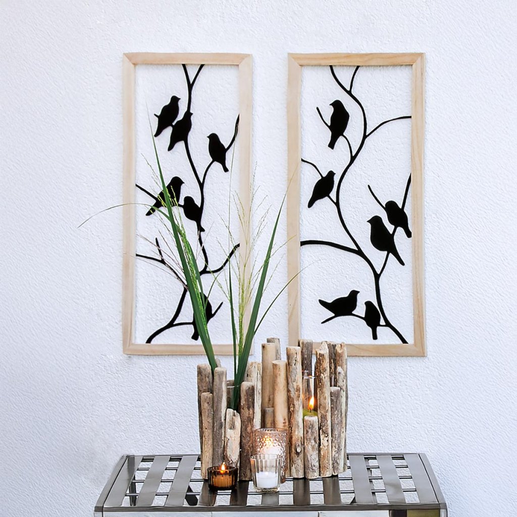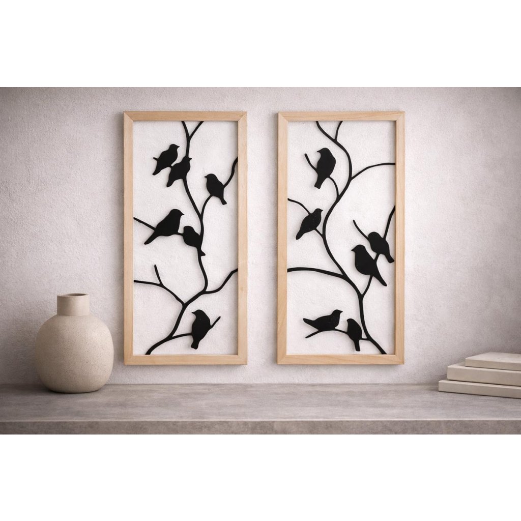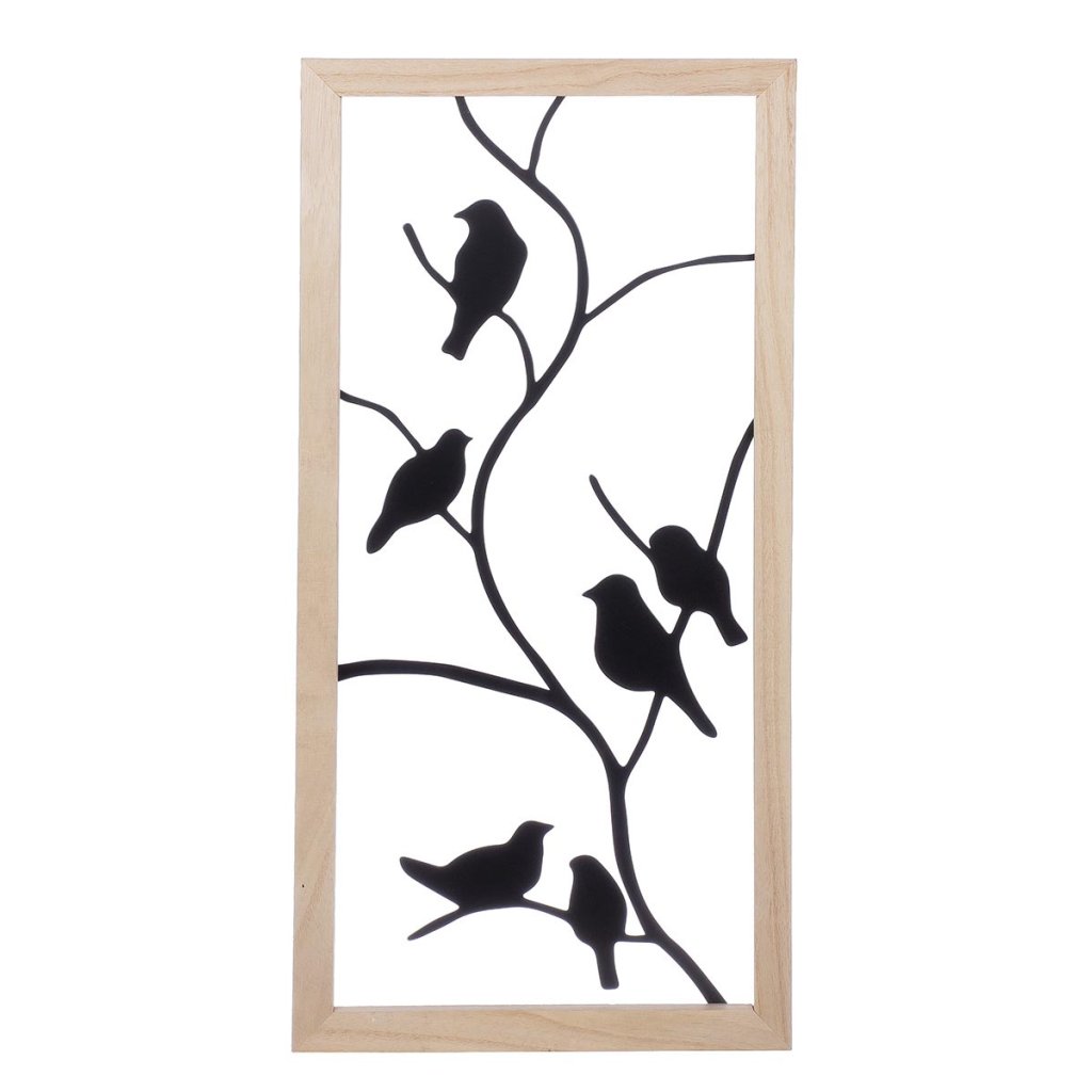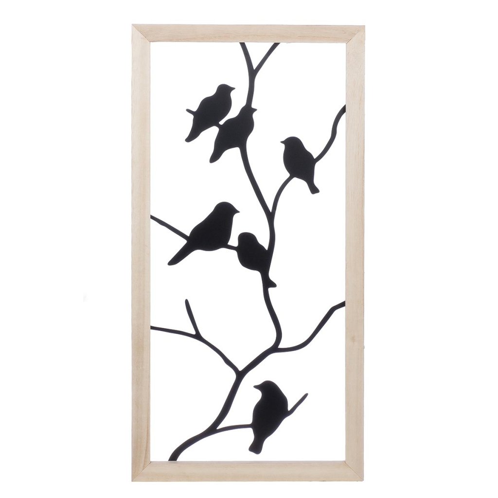 Elegantná nástenná dekorácia s motívom vtákov na vetvách vnesie do interiéru pokoj, ľahkosť a prírodnú atmosféru. Čierne kovové siluety nádherne kontrastujú so svetlým dreveným rámom a vytvárajú moderný a zároveň útulný vzhľad.