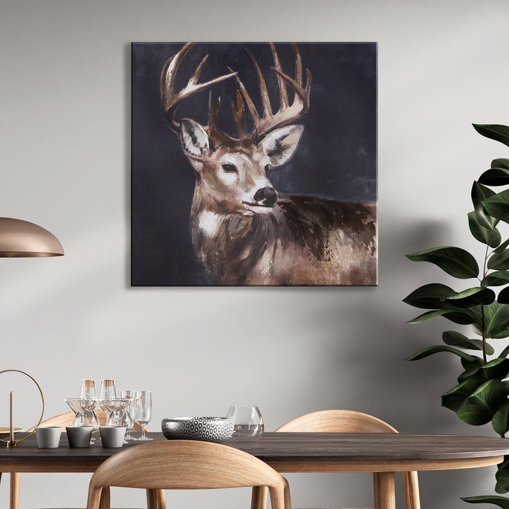Dekorácia na stenu Jelen vnesie do vášho interiéru pokoj, harmóniu a nádych prírody. Motív majestátneho jeleňa v teplých hnedých a čiernych tónoch pôsobí elegantne a zároveň výrazne. Detailné spracovanie na kvalitnom plátne vytvára pôsobivý vizuálny efekt, ktorý sa stane štýlovou dominantou obývačky, jedálne aj pracovne. Nástenná dekorácia krásne vynikne v kombinácii s drevom a prírodnými materiálmi a dá sa ľahko kombinovať s inými prírodnými motívmi. Štvorcový formát obrazu dodáva stene modernú vyváženosť a čistý vzhľad.