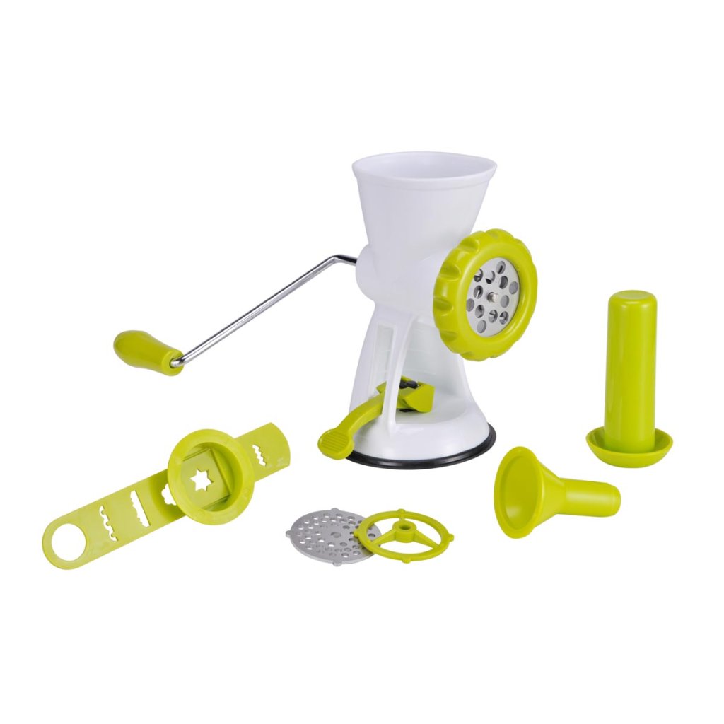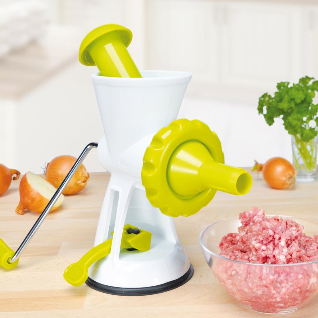 Univerzálny mlynček na mäso alebo cesto s pevnou prísavkou a rôznymi nástavcami.