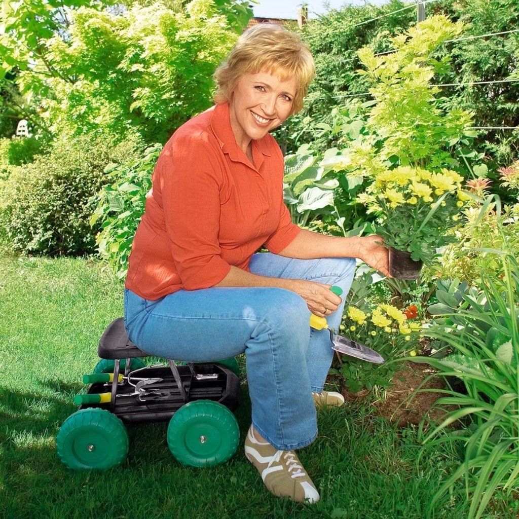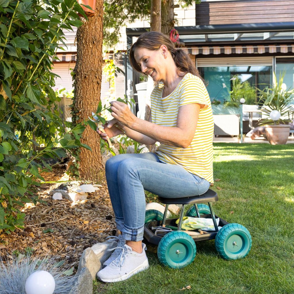 S týmto pojazdným sedadlom teraz môžete robiť všetky záhradné práce pohodlne v sede – a tím odľahčíte hlavne svojej chrbtici! Výška sedadla je obzvlášť príjemná, po ruke je tiež úložný priestor na náradie. Veľké kolesá umožňujú dobrý pohyb v teréne!
