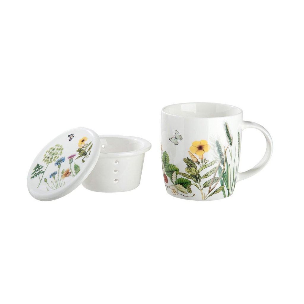 Elegantná čajová súprava poteší všetkých milovníkov štýlového stolovania. Tento čajník so sitkom a pokrievkou je vyrobený z kvalitného porcelánu a zdobený jemným motívom lúčnych kvetov a motýľov. Nadčasový dizajn porcelánového riadu vnesie do vášho interiéru ľahkosť a eleganciu.