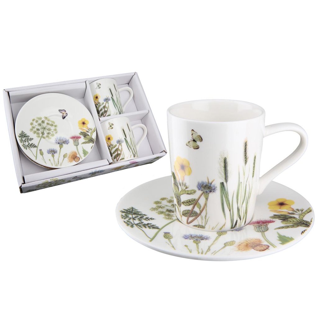 Elegantná súprava porcelánových šálok a podšálok Wild Flowers vnesie do vášho stolovania jemnosť a romantický vidiecky štýl. Tieto štýlové šálky na kávu sú zdobené motívom kvetov a motýľov, ktoré krásne doplnia váš porcelánový riad.