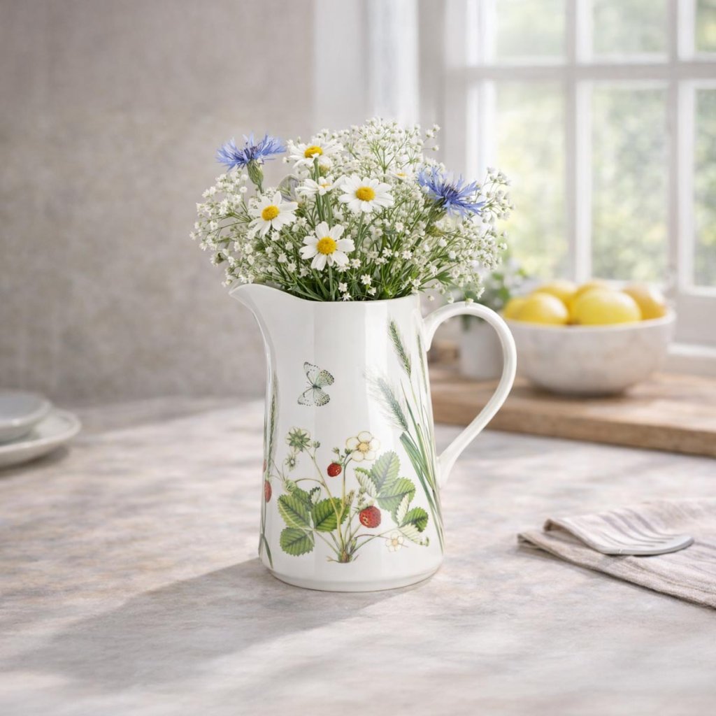 Elegantný porcelánový džbán je skutočnou ozdobou každého prestretého stola. Jemný motív lúčnych kvetov dodáva džbánu svieži, romantický vzhľad a krásne sa kombinuje s ostatným porcelánovým riadom z tejto kolekcie. Vďaka svojmu nadčasovému dizajnu je vhodný na slávnostné príležitosti aj na každodenné použitie.
