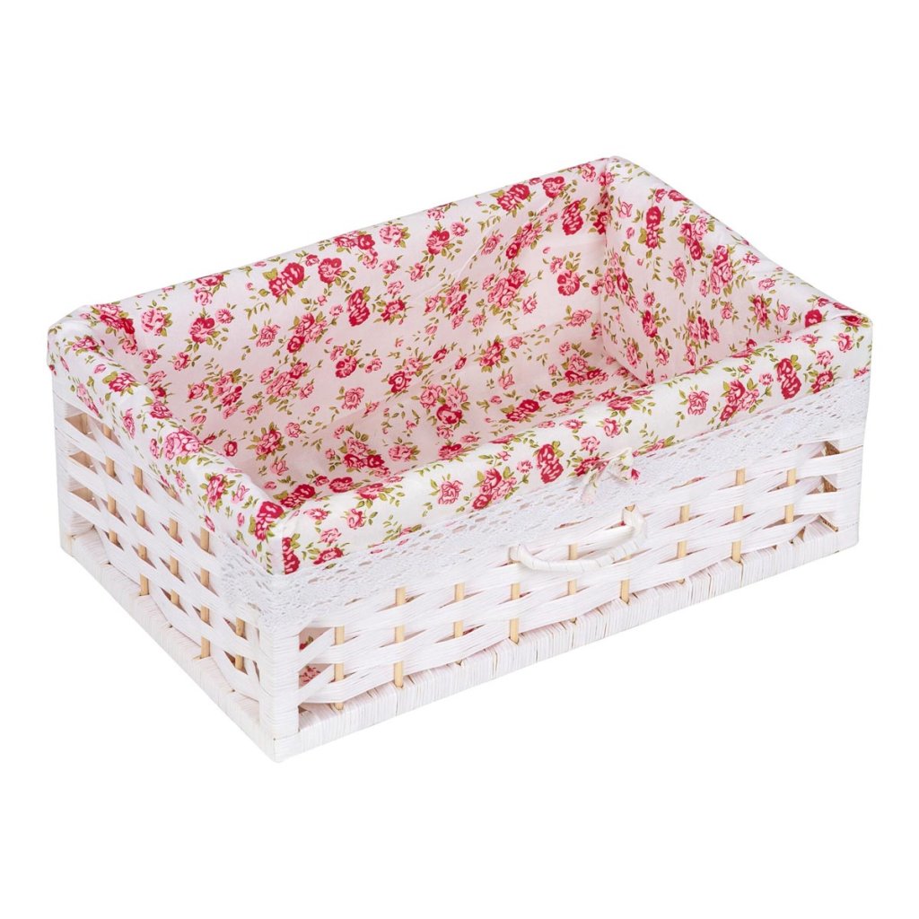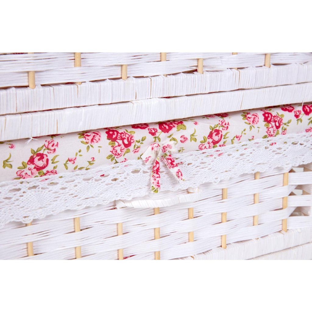Praktické zásuvky s pôvabným motívom ruží, doplnené jemnou čipkou a mašľami, dodávajú komode s košíkmi romantický vzhľad. Horný úložný priestor je ideálny na dekorácie, poháre alebo každodenné potreby. Biela komoda v modernom prútenom dizajne vytvára príjemnú atmosféru plnú elegancie a nostalgie a krásne doplní spálňu, predsieň aj obývaciu izbu.