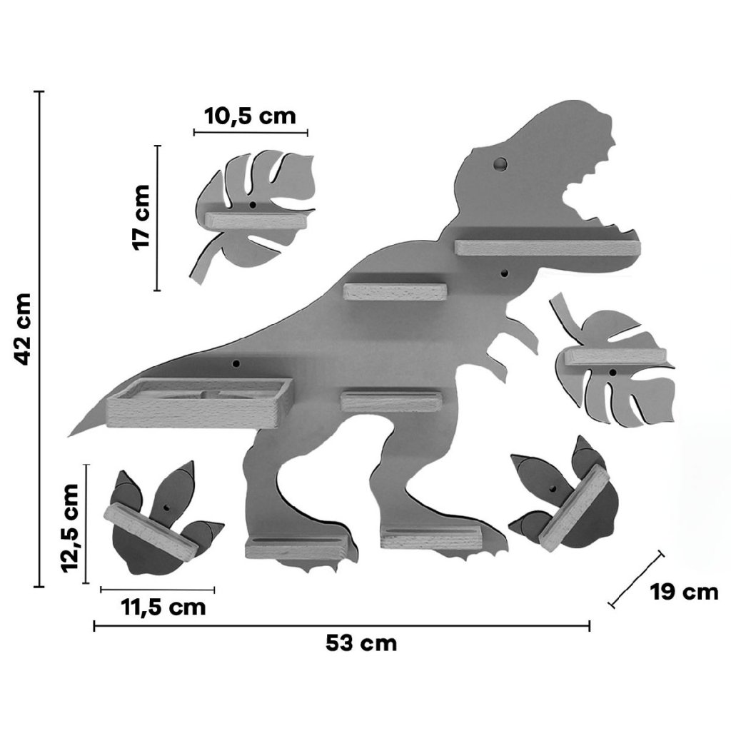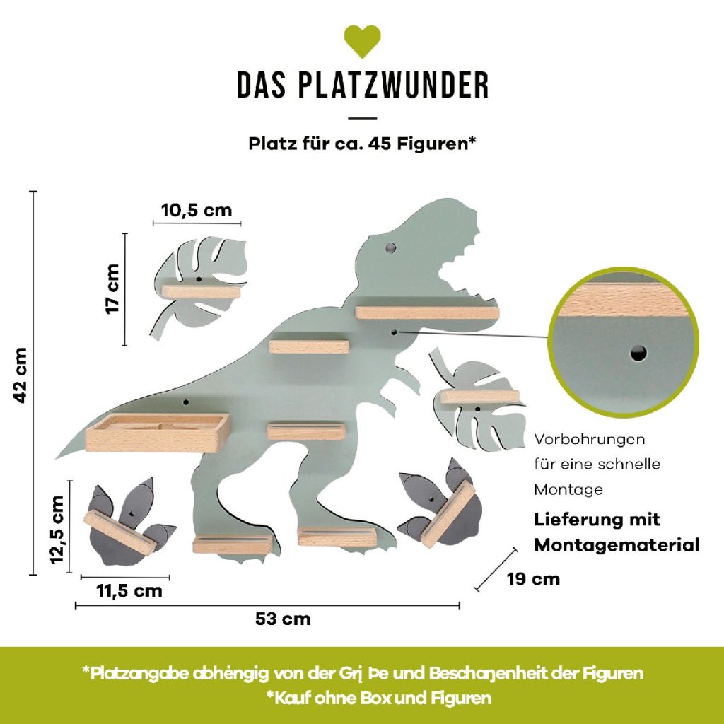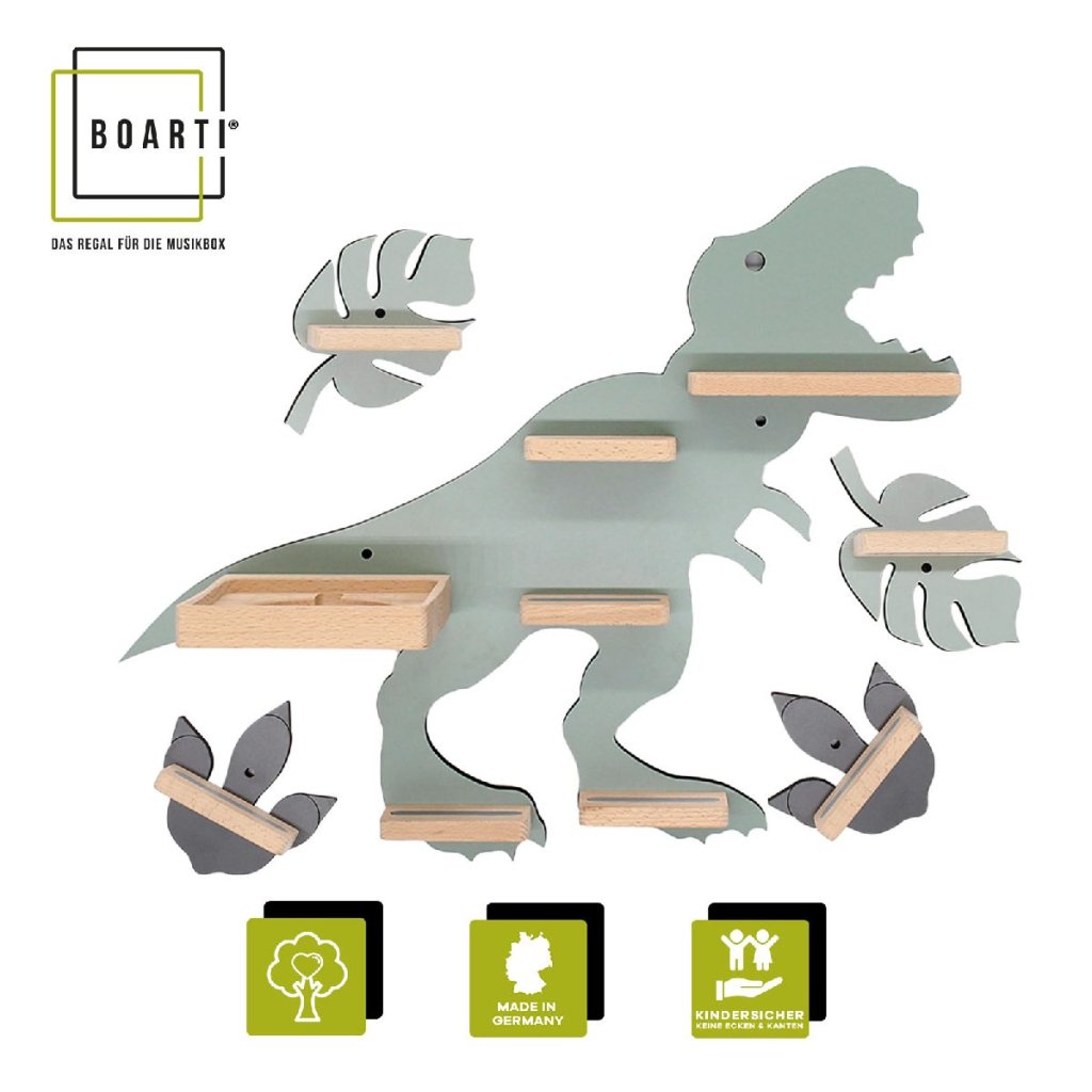 BOARTI - polička pre Toniebox a približne 45 Tonies. Dizajnér vyvinul túto nástennú policu pre všetkých fanúšikov dinosaurov. Dinosaurus premení detskú izbu na prehistorickú džungľu a rozžiari nielen detské oči. BOARTI s jedinečným dizajnom - to je hneď jasné každému, kto vlastní Toniebox a kolekciu! Žiarivá nástenka do detskej izby. Úhľadná a štýlová: svoje miesto tu nájdu nabíjacie stanice a figúrky. Už žiadne lietajúce figúrky. Dizajnér štandardne integroval kovové koľajničky, ktoré figúrky bezpečne pripevnia k poličke a zabezpečia, aby zostali na svojom mieste. BOARTI je značka rodinnej spoločnosti VCM, ktorá sa od 70. rokov minulého storočia špecializuje na navrhovanie, výrobu a predaj cenovo výhodného nábytku a skrášlila už milióny domácností.Dodatočné parametre