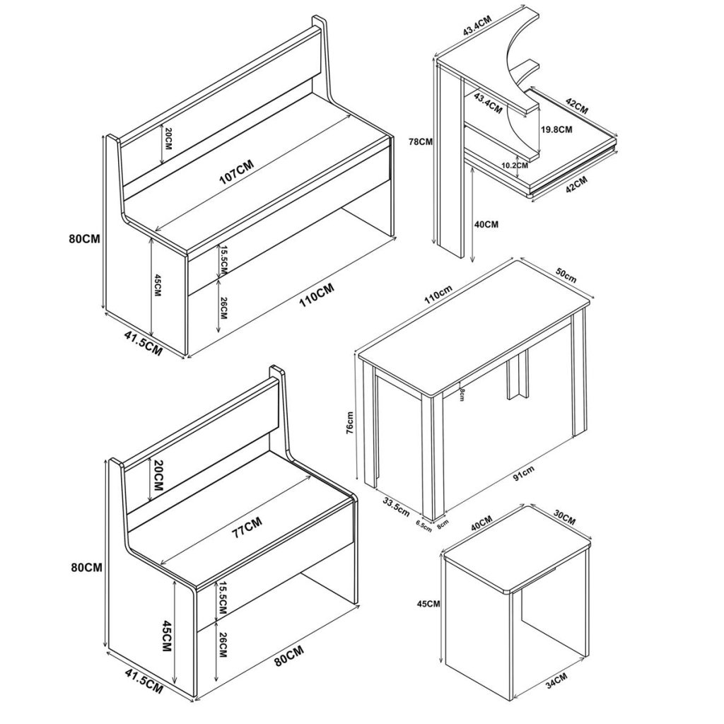 Hlavné vlastnosti - Celkové rozmery cca v. 80 x š. 153 x hl. 153 cm - Priestorový zázrak pre každú jedáleň - Kvalitné a robustné spracovanie - Sedadlo sa skladá naplocho. Pohovka "Esal Maxi" od spoločnosti VCM je priestorový zázrak pre každú jedáleň. Lavica sa dá namontovať na obe strany. Súprava nábytku je nielen pútavá na pohľad, ale aj veľmi šikovný funkčný kus nábytku, pretože lavice ponúkajú praktický úložný priestor. Jedálenský stôl: - Rozmery stola približne v. 76 x š. 110 x hl. 50 cm - Malý kompaktný stôl pre dokonalé využitie priestoru. Lavica: - Rozmery každej lavice cca v. 80 x š. 110 x hl. 42 cm - Praktický úložný priestor vďaka sklopnému sedáku Stolička: - Rozmery dvoch stoličiek cca v. 45 x š. 40 x hl. 30 cm - Stoličku možno umiestniť pod stôl - Praktická, a preto sa dá používať samostatne Rohové spojenie: - Rozmery rohového spojenia cca v. 78 x š. 43 x hl. 42 cm - Na dokonalé využitie rohu sa spoločnosť VCM od 70. rokov minulého storočia špecializuje na navrhovanie, výrobu a distribúciu nábytku s primeraným pomerom cena/výkon a zdobí ním milióny domácností.Dodatočné parametre