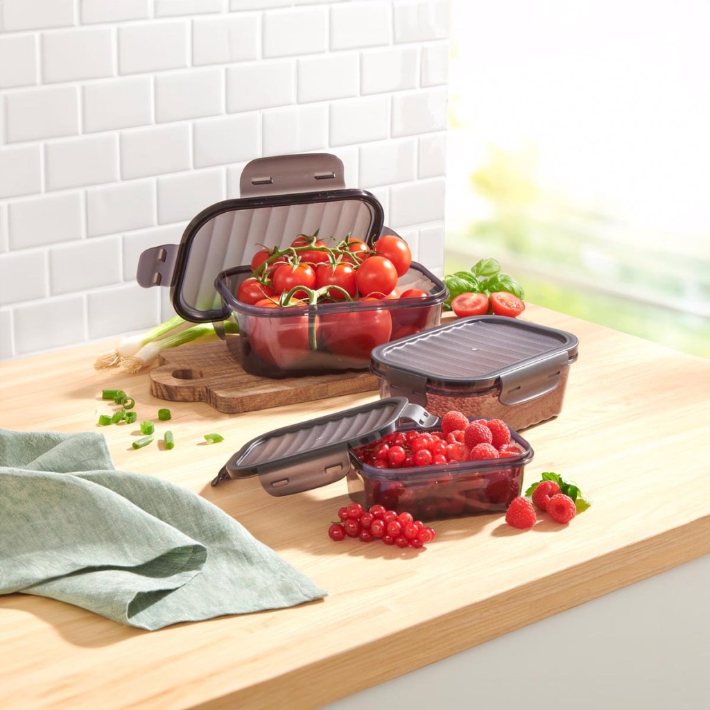 Súprava štýlových dóz na potraviny s uzáverom na zacvaknutie a tesniacim krúžkom chráni obsah pred stratou chuti a uchováva potraviny dlhšie čerstvé. Dózy na potraviny dokonale tesnia a dajú sa skladať do seba, čím šetria miesto v skrini a chladničke. Skvelé na skladovanie potravín.